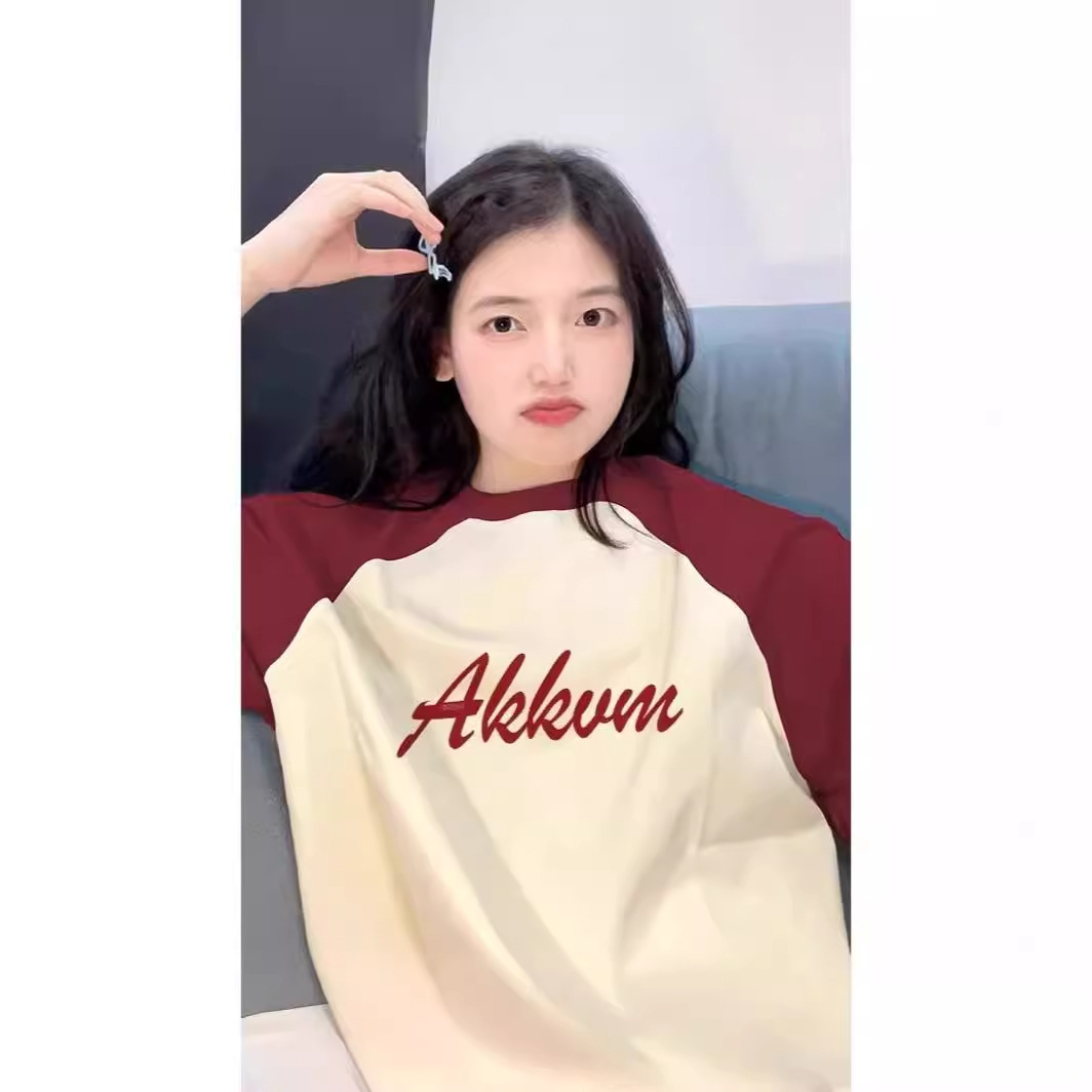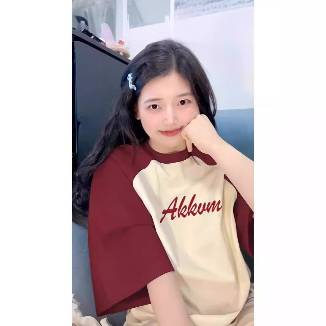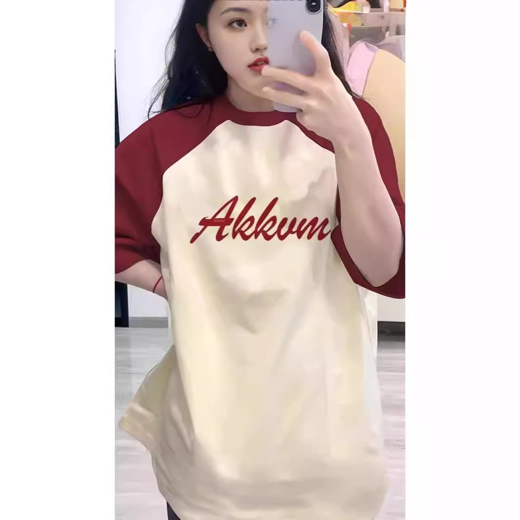 酒红色插肩字母印花t恤女短袖宽松夏季纯棉上衣oversize拼接体恤