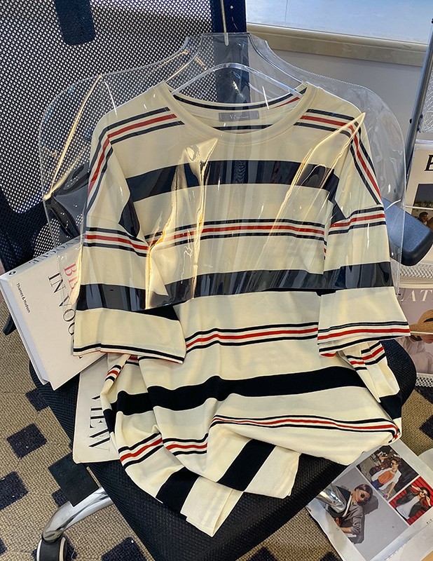 夏季慵懒风宽松撞色条纹棉质短袖t恤女半袖中长款短袖上衣潮