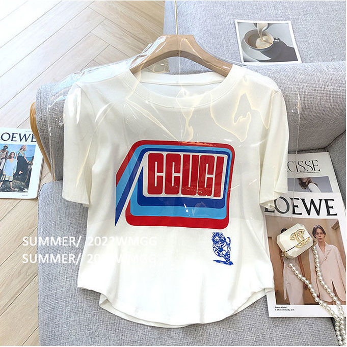白色短袖T恤女夏季薄款设计感小众法式宽松气质字母印花短款上衣