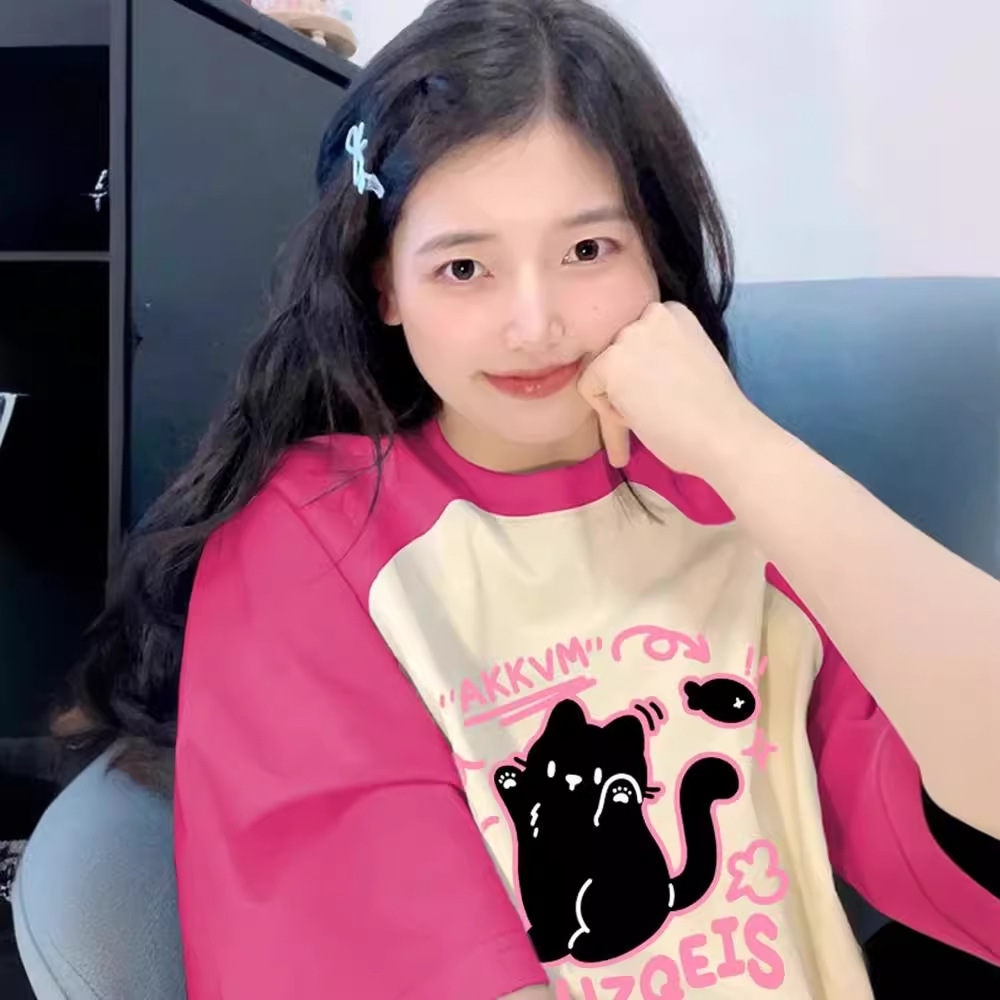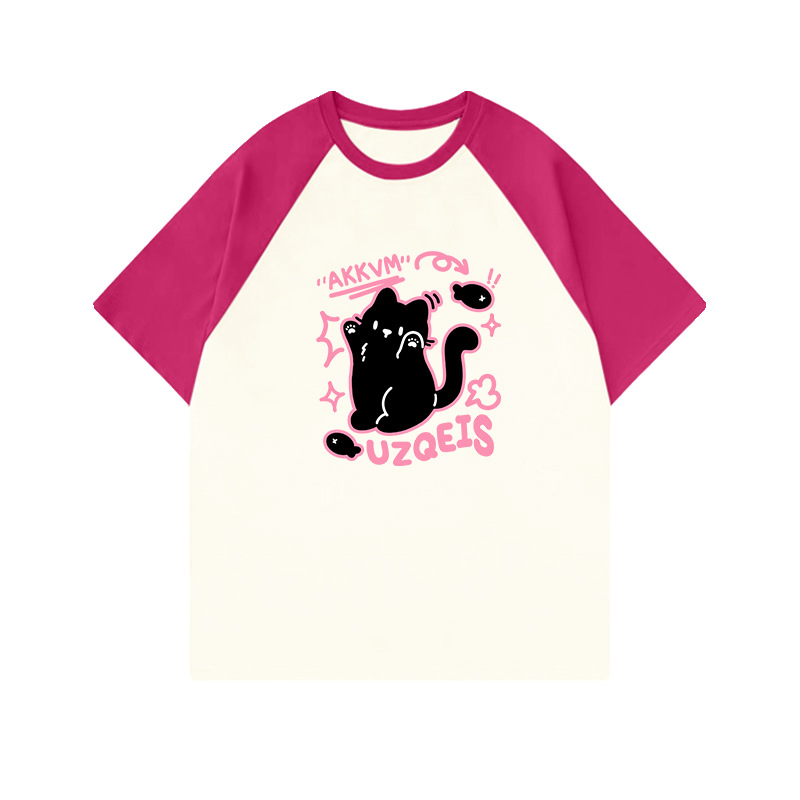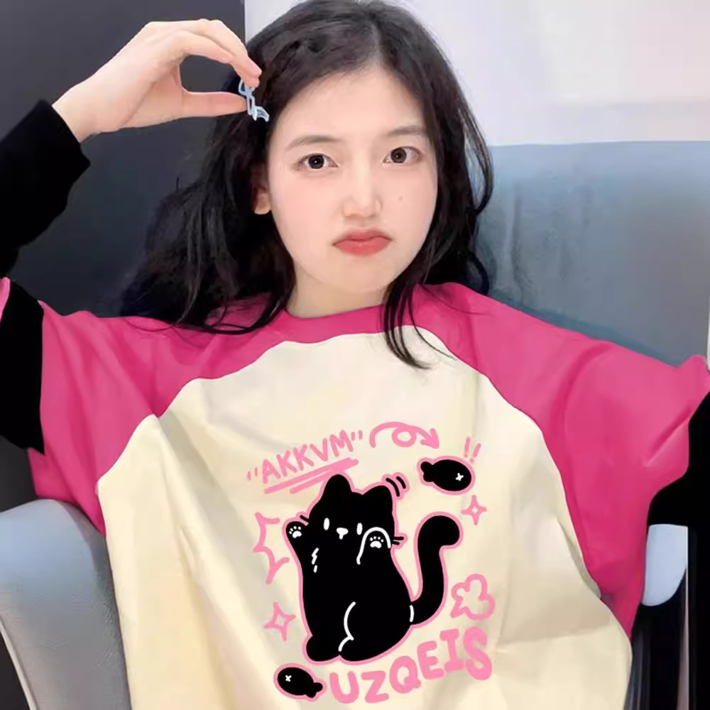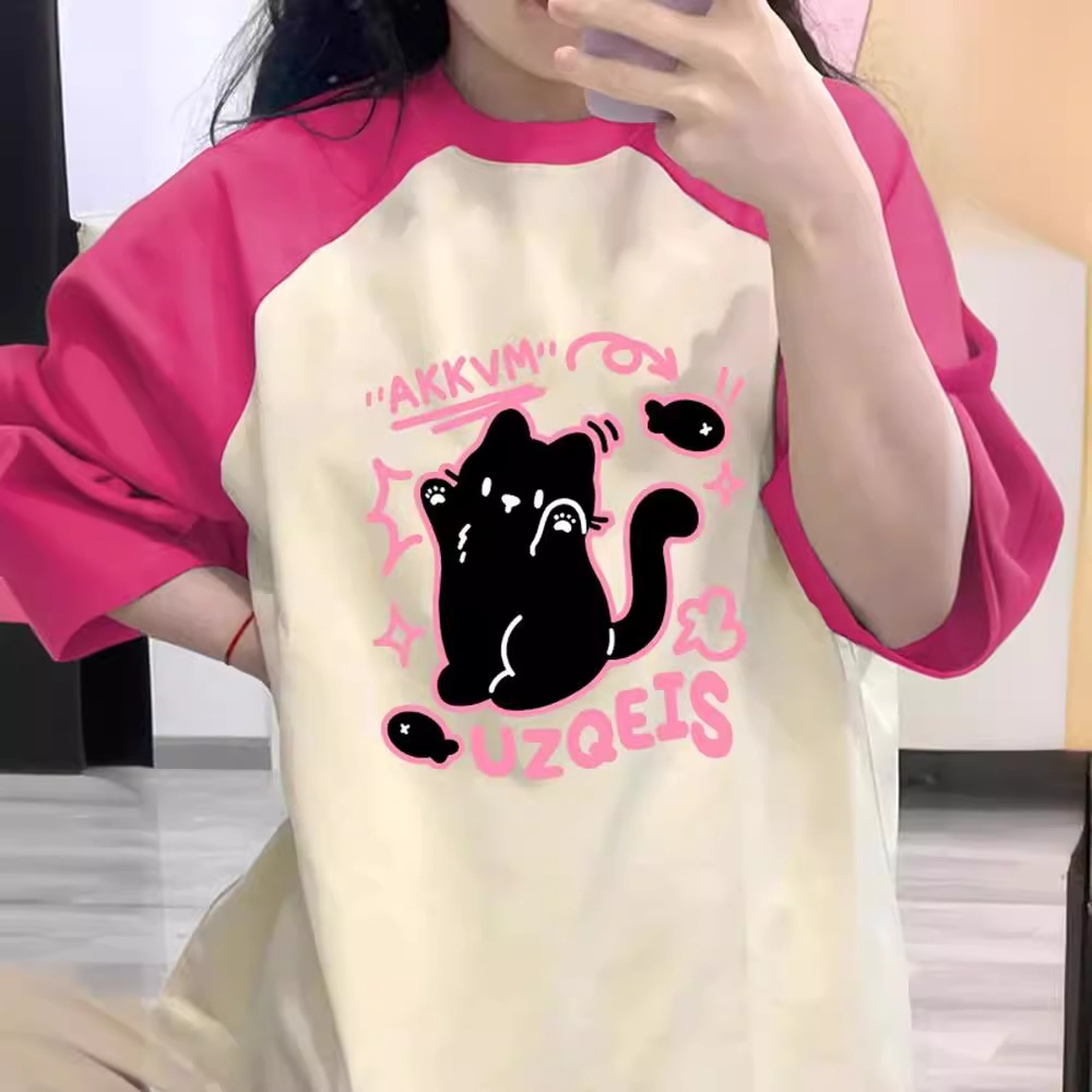 美式复古插肩纯棉短袖t恤女夏季休闲百搭大码宽松撞色设计感上衣