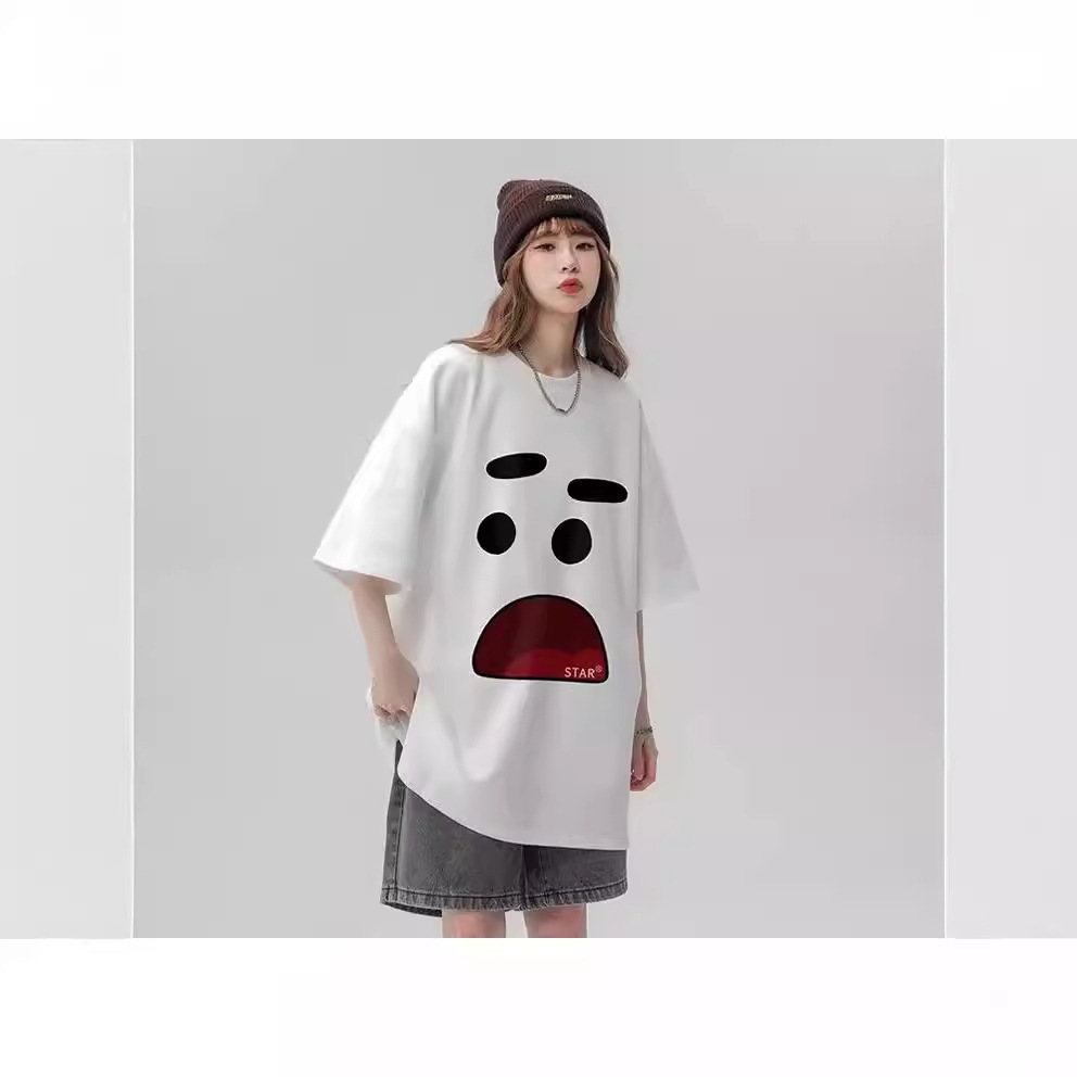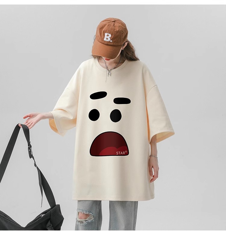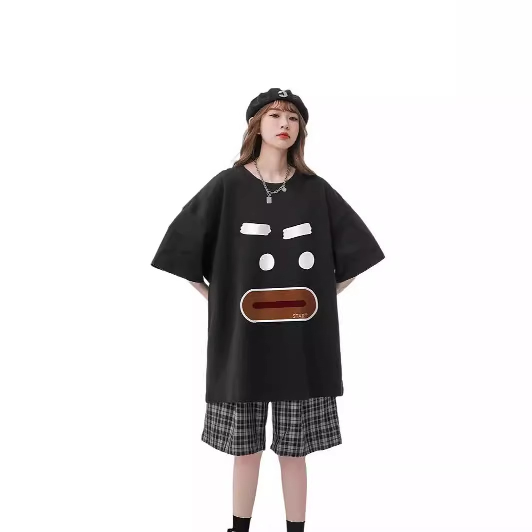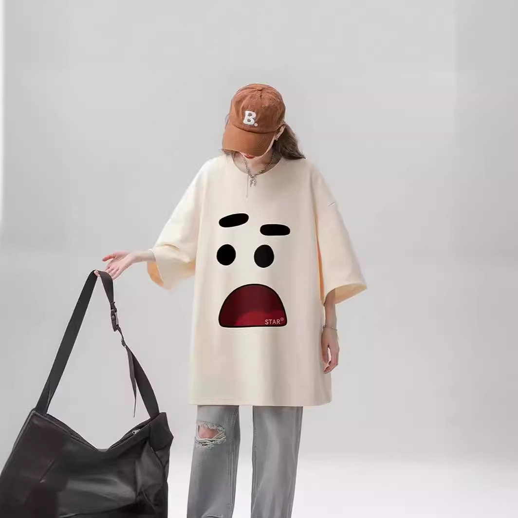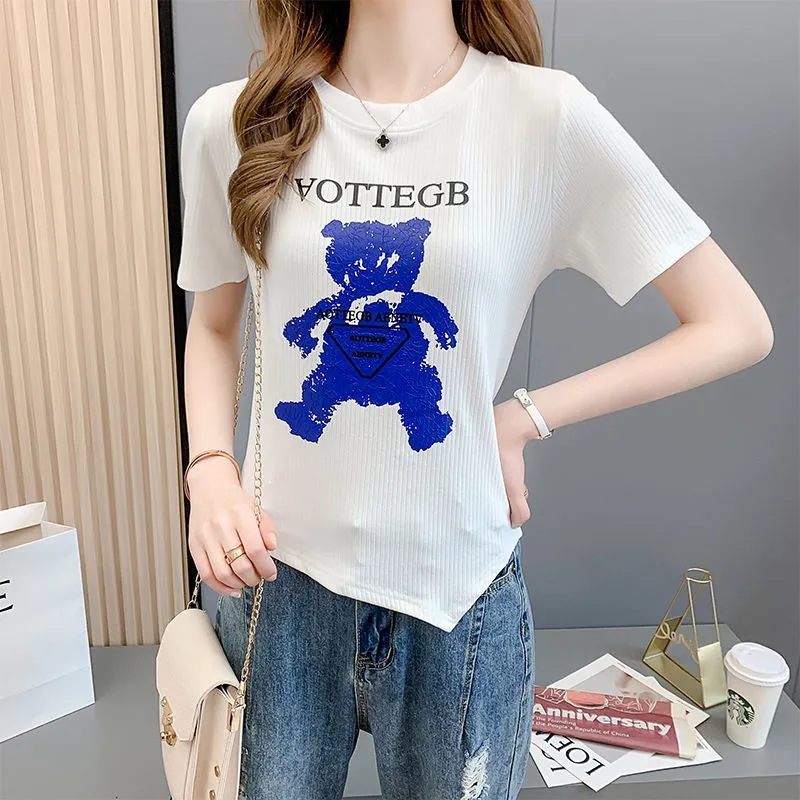 白色圆领小熊印花不规则短袖t恤女夏季新款时尚修身显瘦上衣