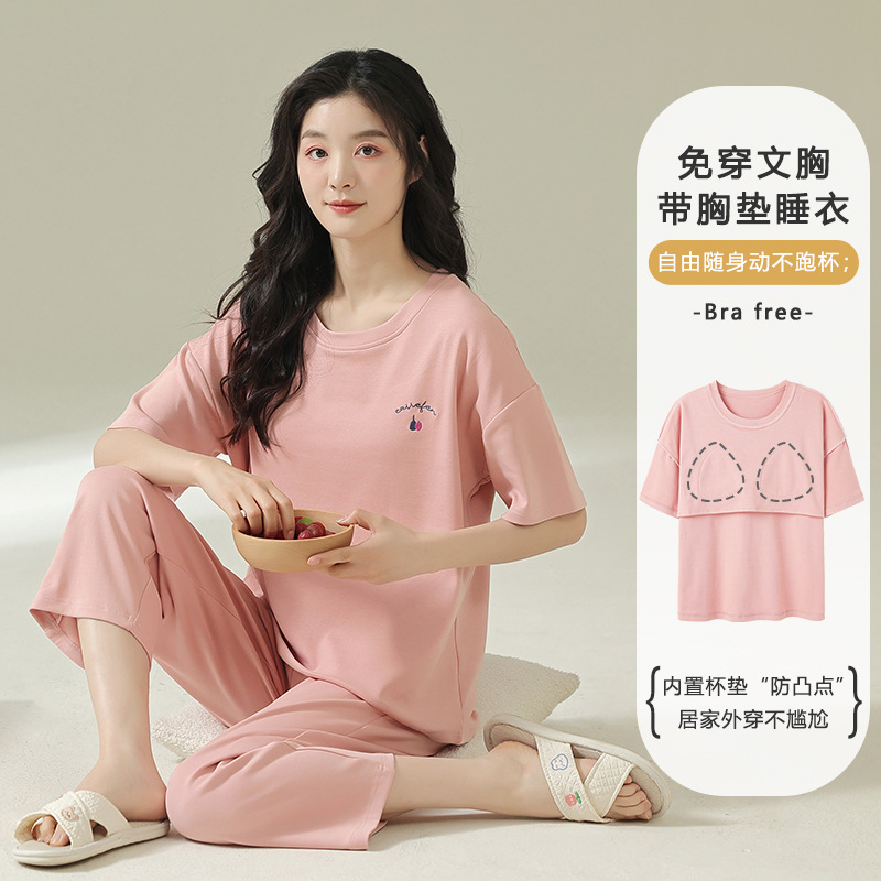 新款带胸垫睡衣女夏季纯棉短袖七分裤甜美休闲可外穿家居服