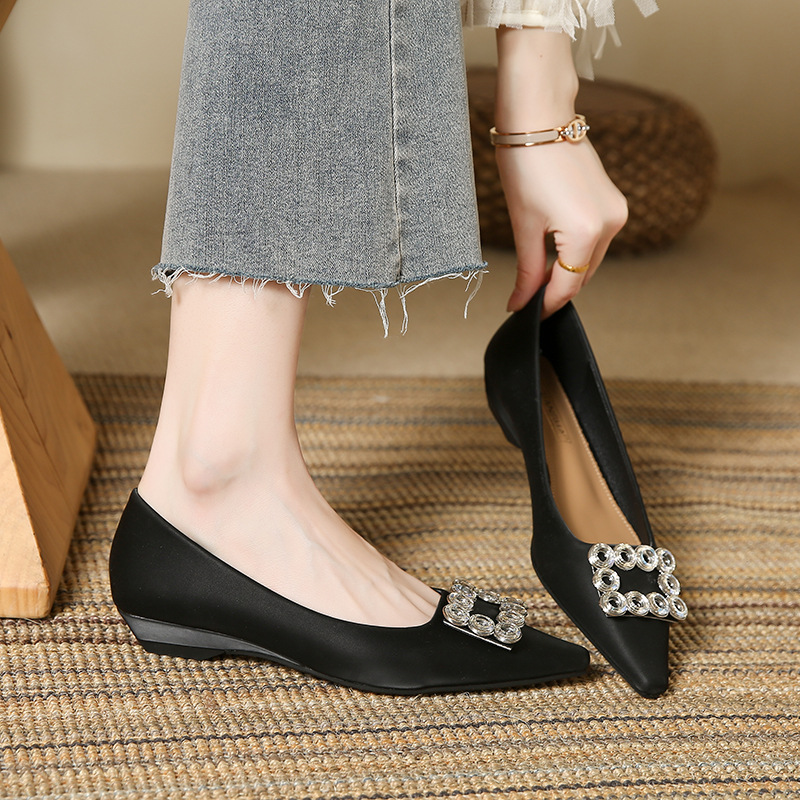 新款小矮跟单鞋女法式轻奢裸色水钻浅口方扣女鞋通勤不累脚