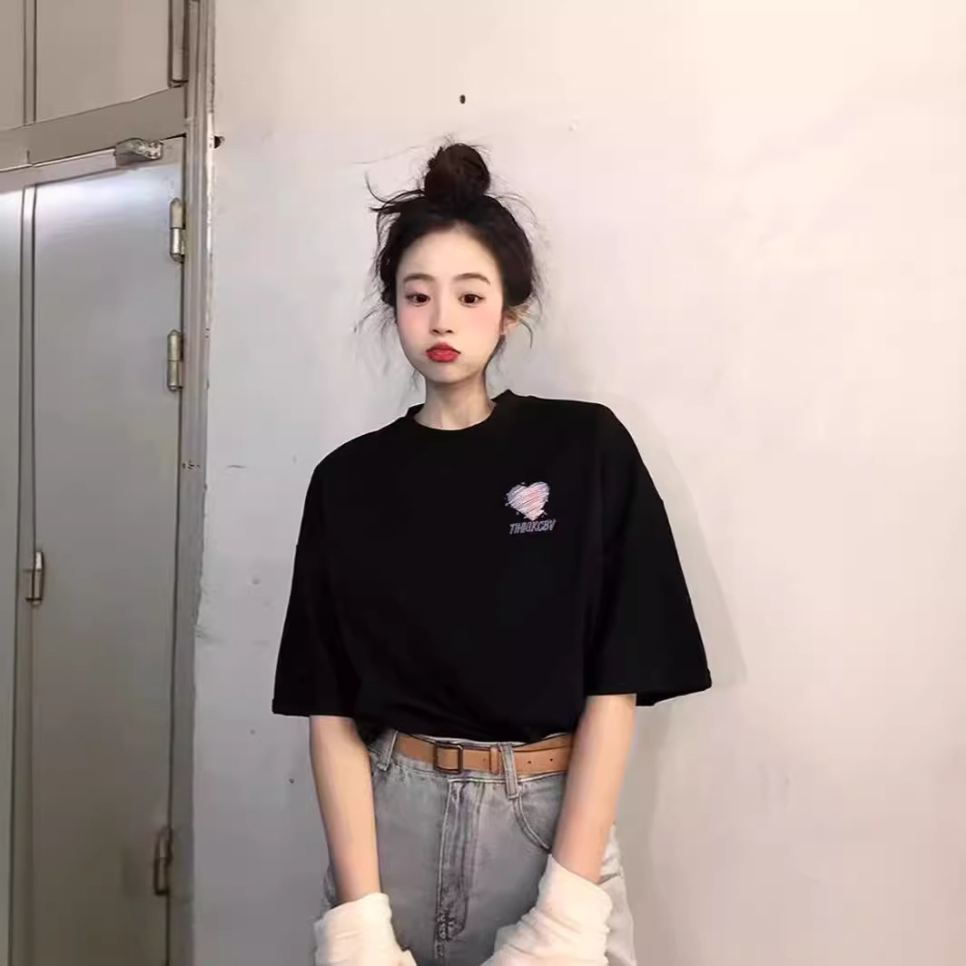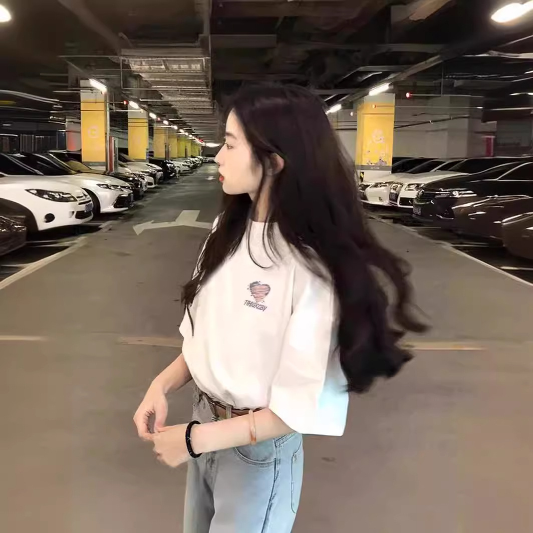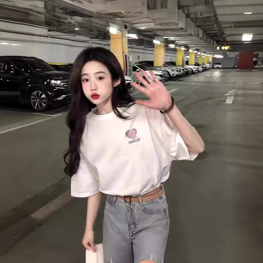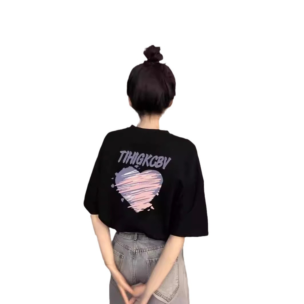 韩版宽松纯棉重磅t恤女短袖设计感小众卡通印花百搭圆领上衣夏季