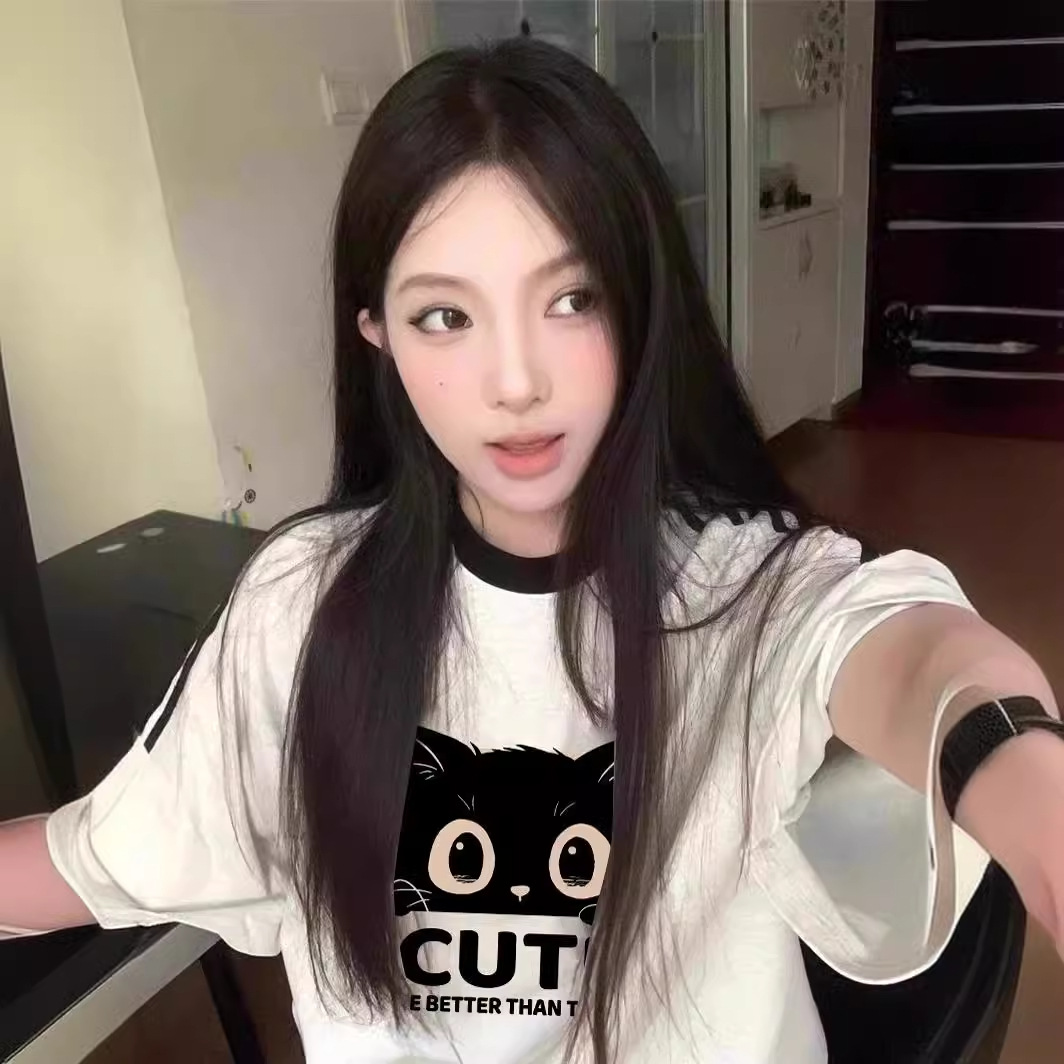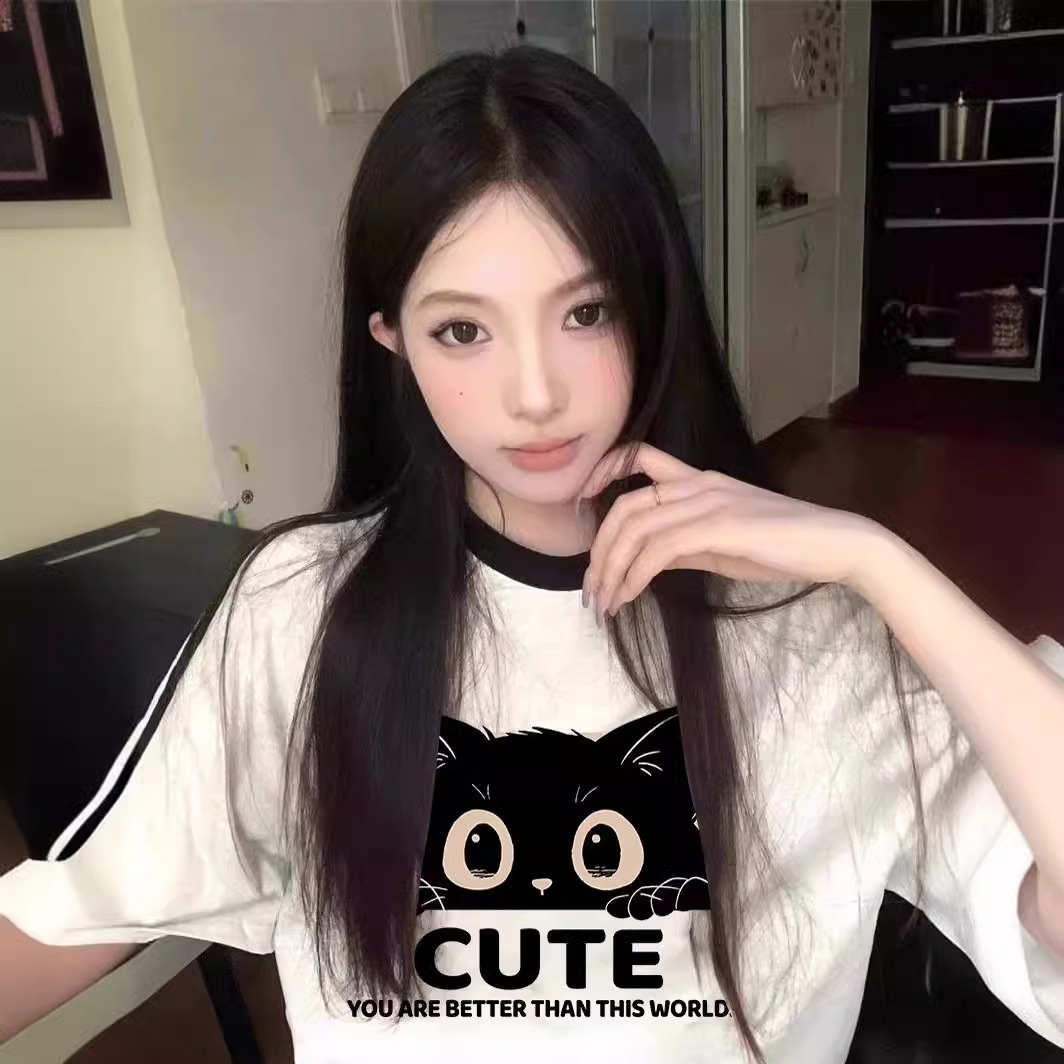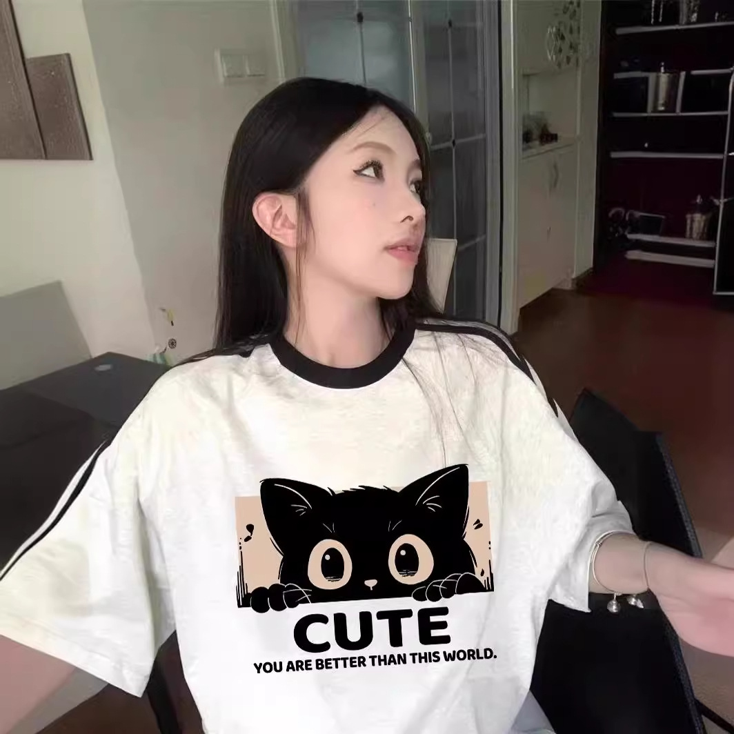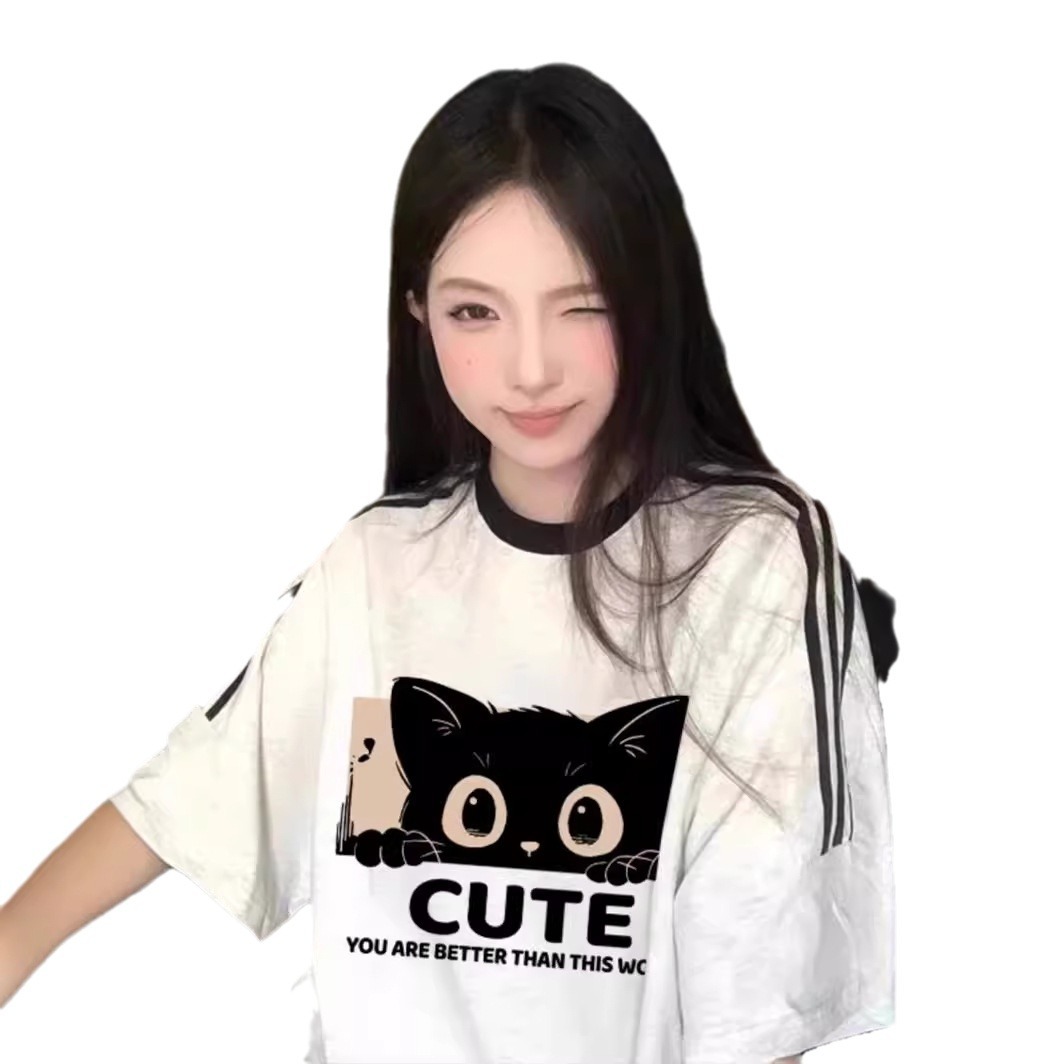 花灰美式复古猫咪潮牌撞色短袖T恤女夏新款设计感宽松三条杠上衣