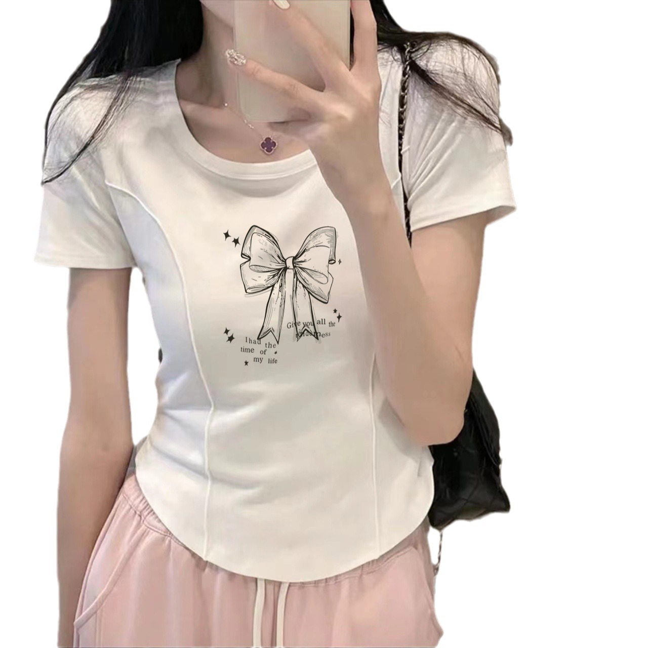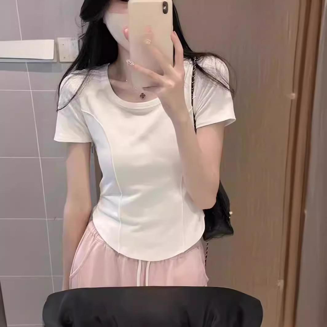纯棉正肩鱼骨紧身掐腰不规则短袖t恤女夏季设计感小众小个子上衣