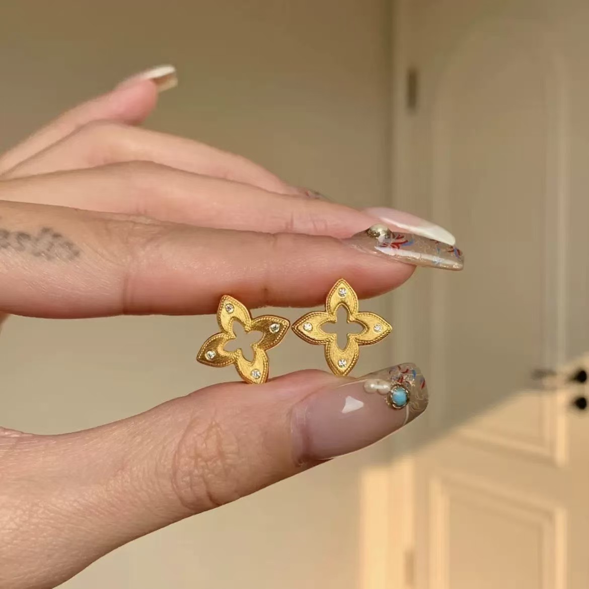 小红书爆款中古风拉丝芒星幸运四叶草耳钉精致贵气四叶花拉丝耳饰