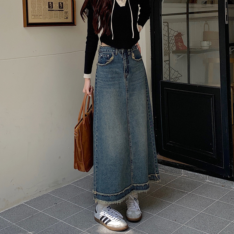 毛边牛仔半身裙女春夏个性街头设计感腰头下摆韩版高腰中长款裙子