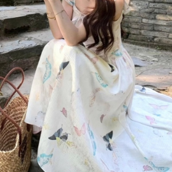 夏季新款法式仙气掐腰修身飞飞袖白色蝴蝶长裙