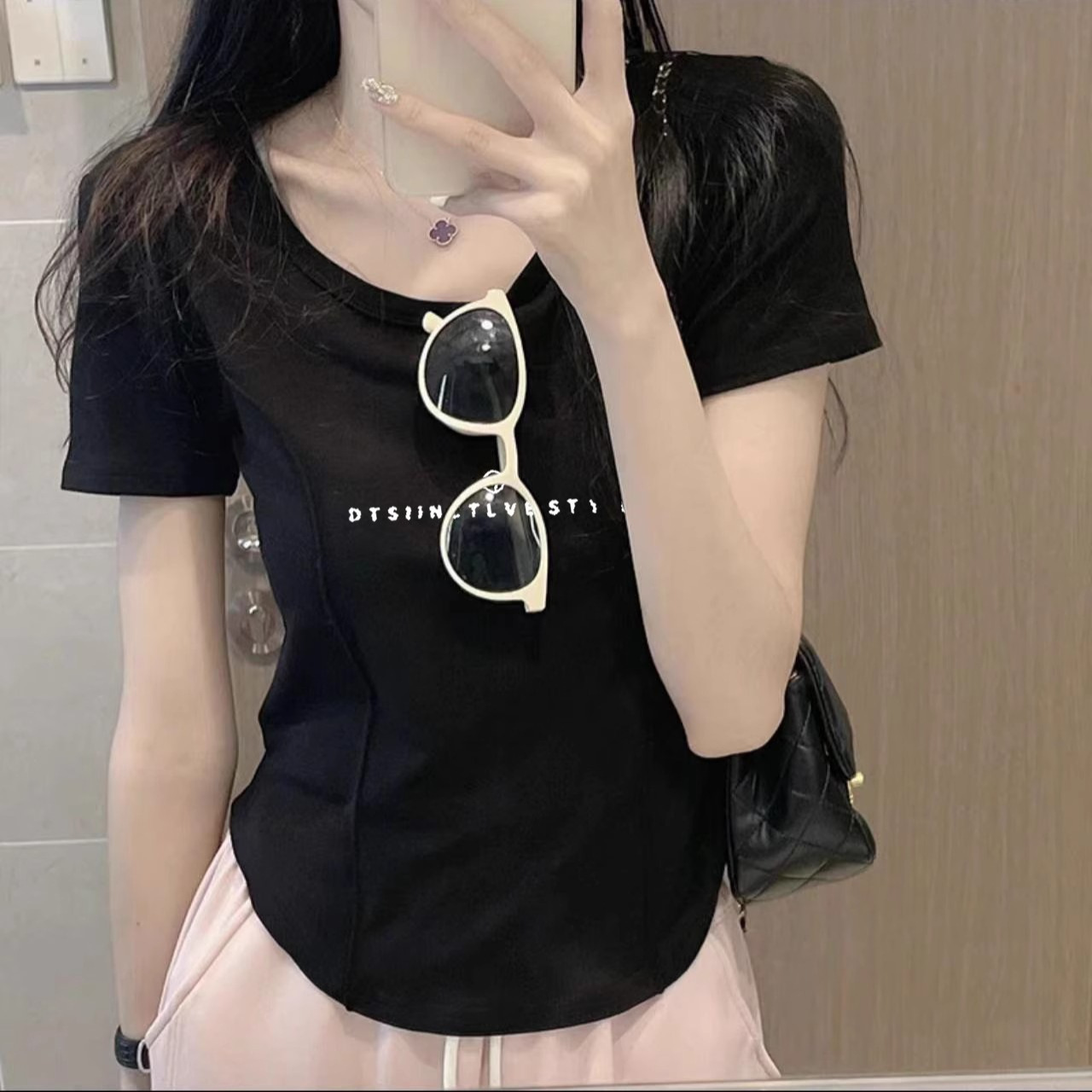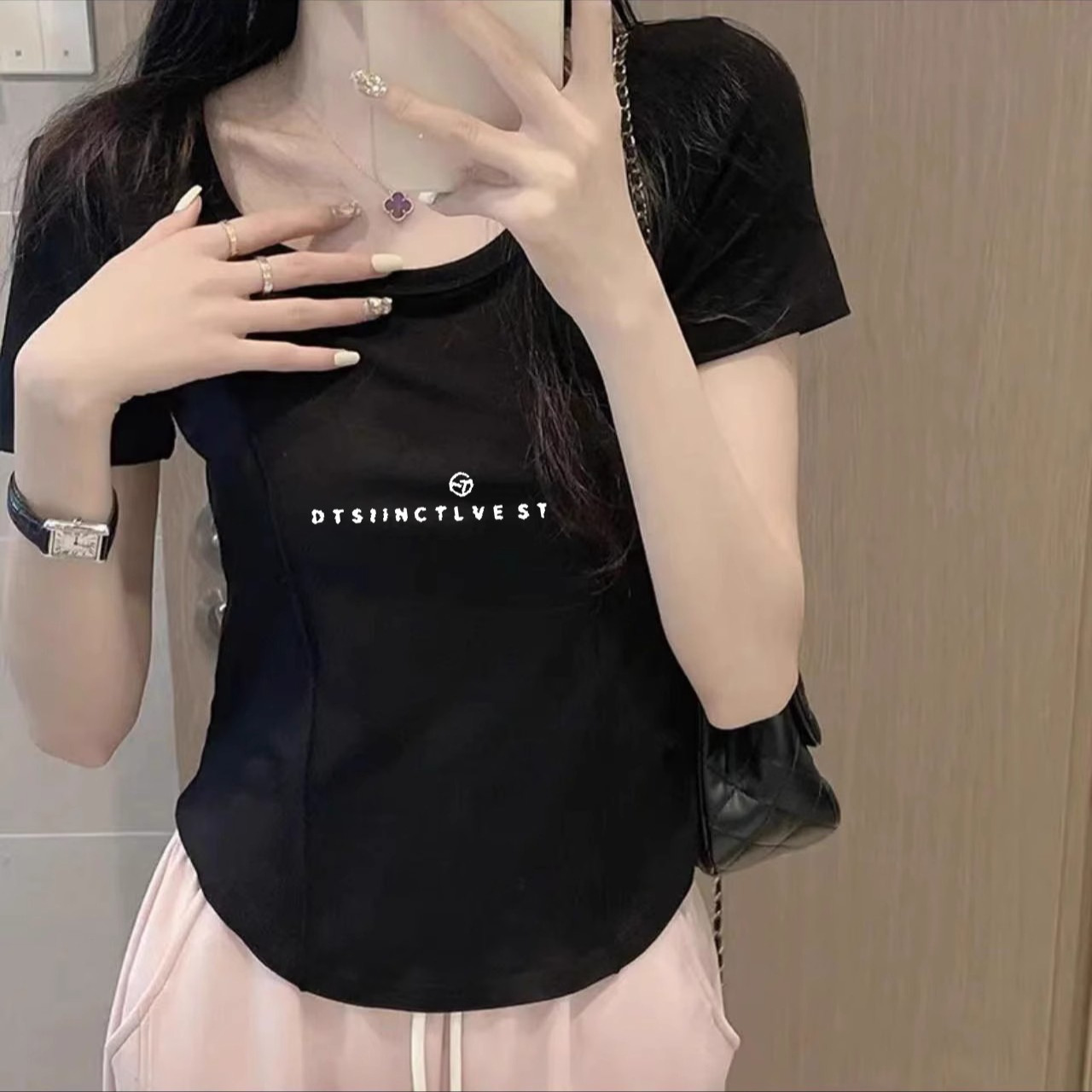 纯棉正肩短款短袖t恤女夏季辣妹白色鱼骨修身卡腰字母减龄上衣ins