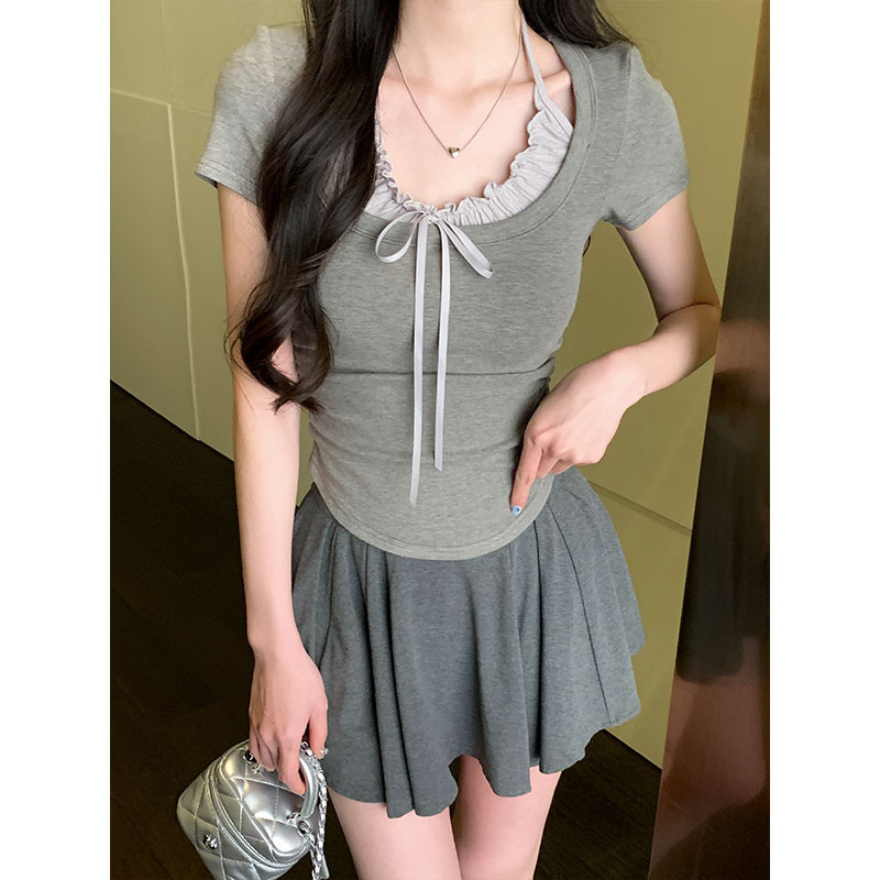 法式纯欲挂脖假两件拼接短袖T恤女夏设计感修身短袖褶皱辣妹上衣