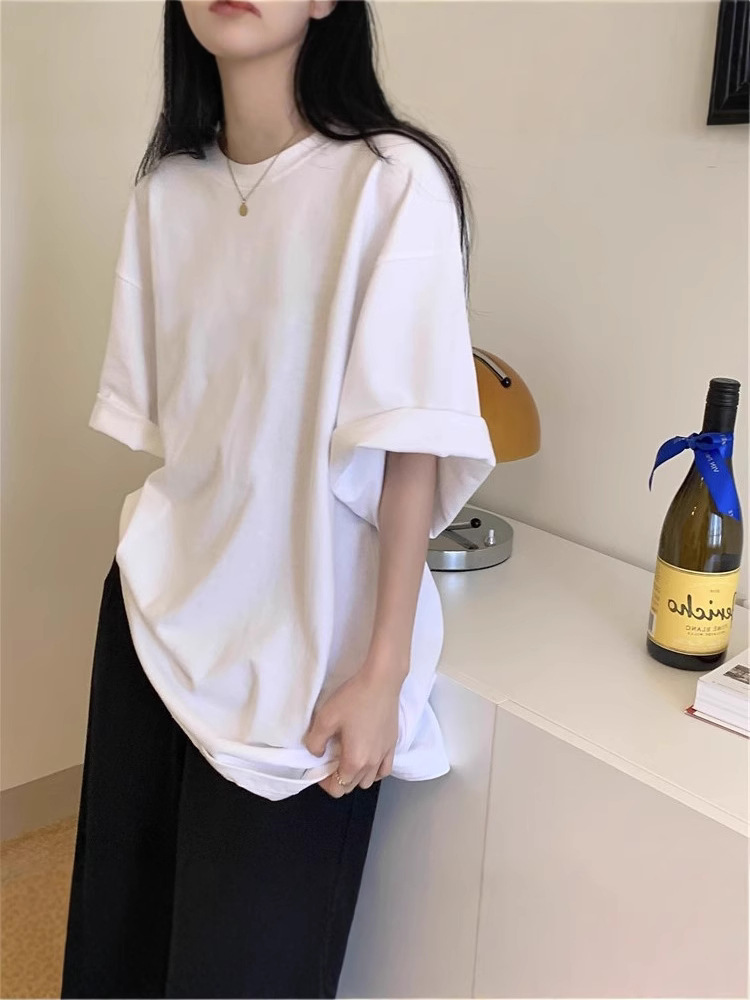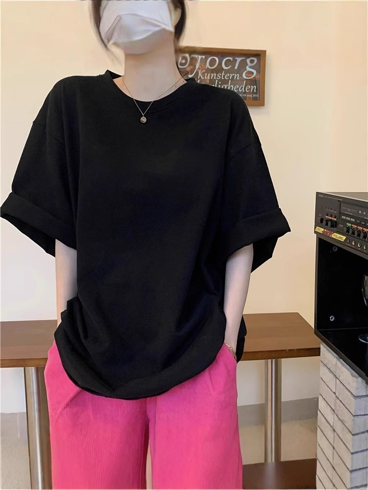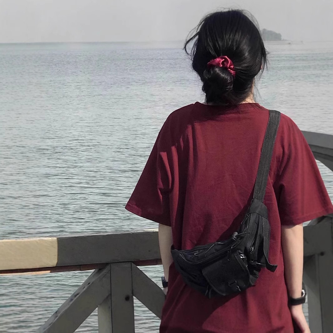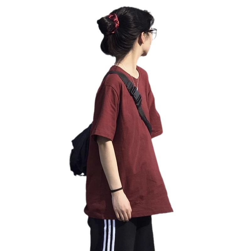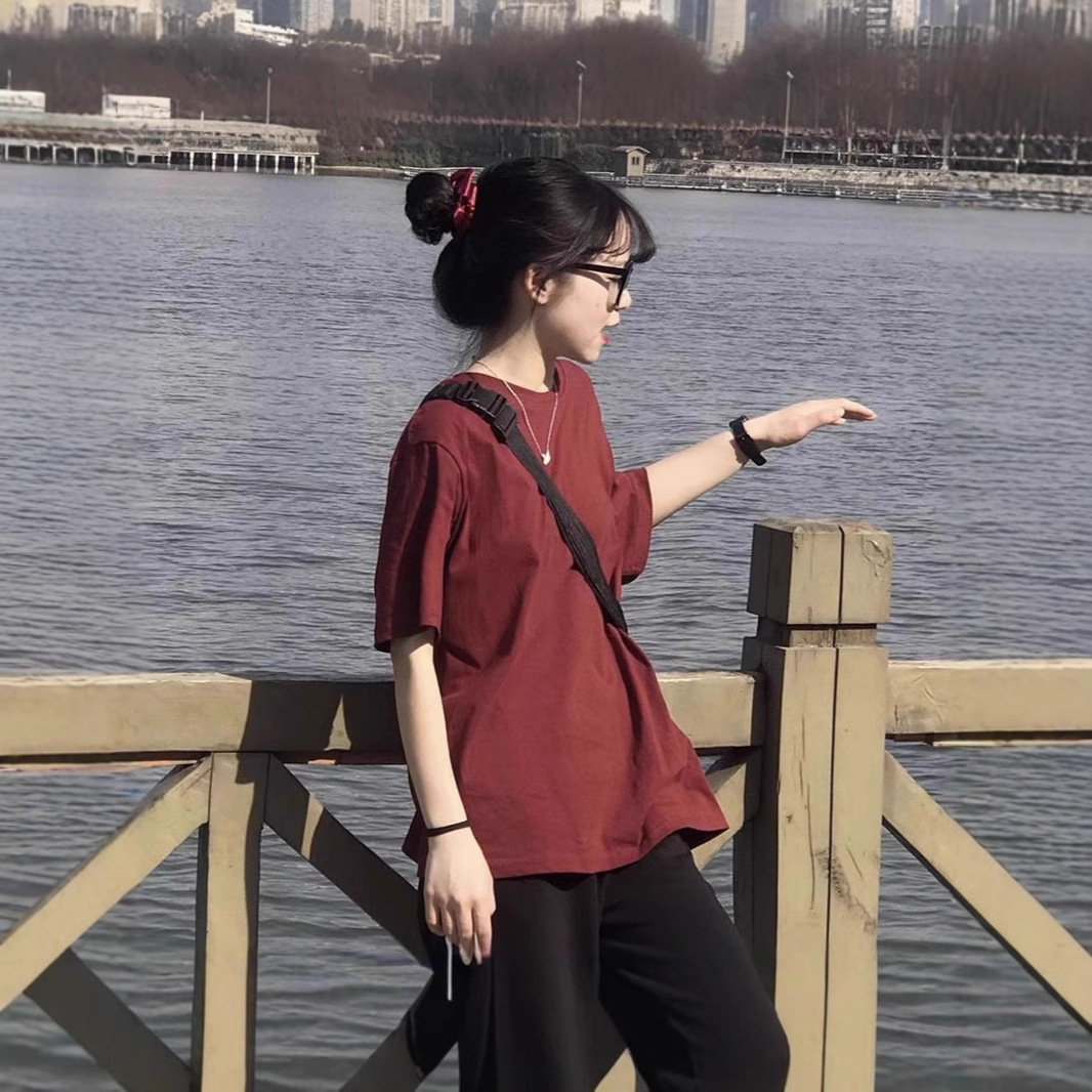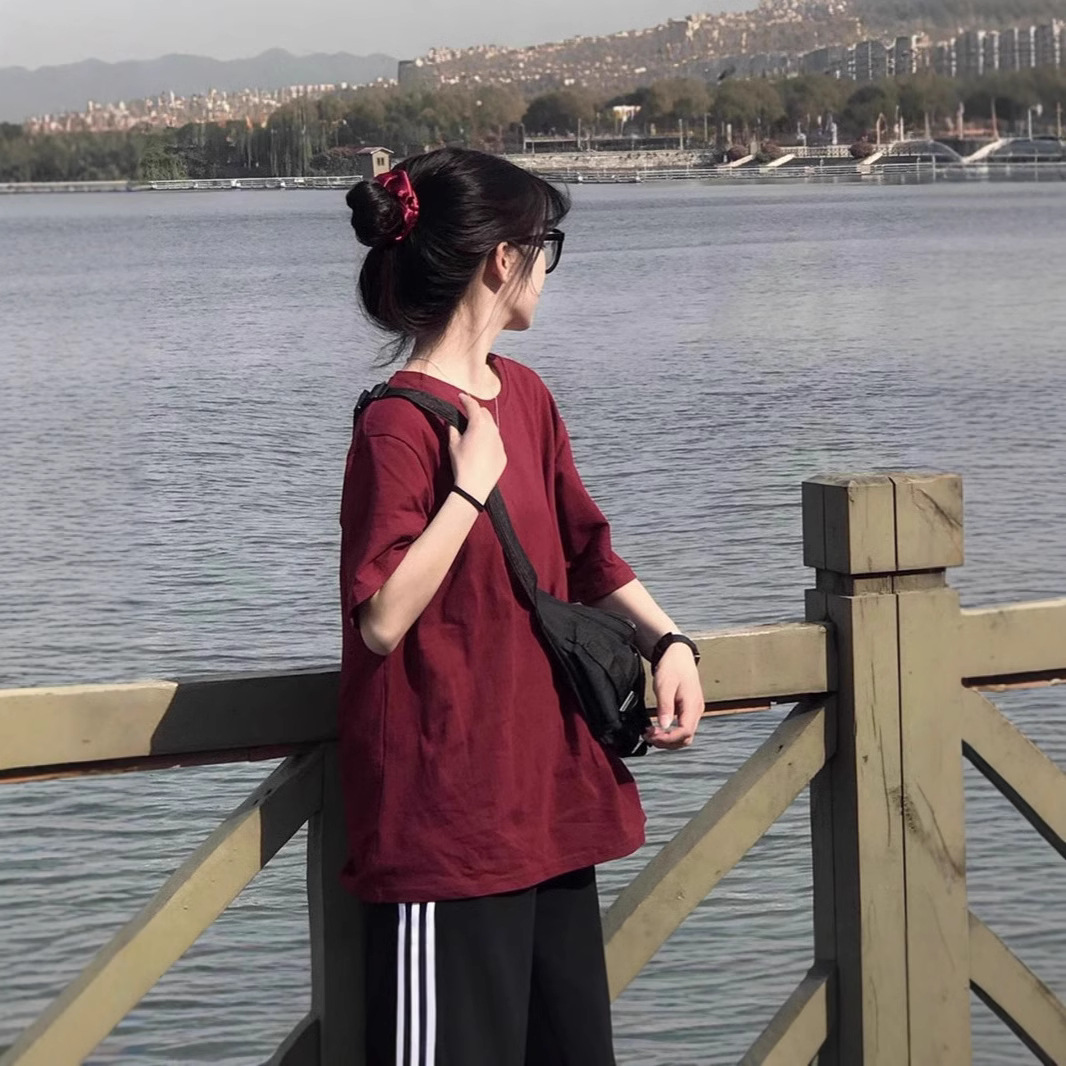 美式复古酒红色短袖t恤女新款夏季宽松大版小个子纯棉上衣ins潮牌