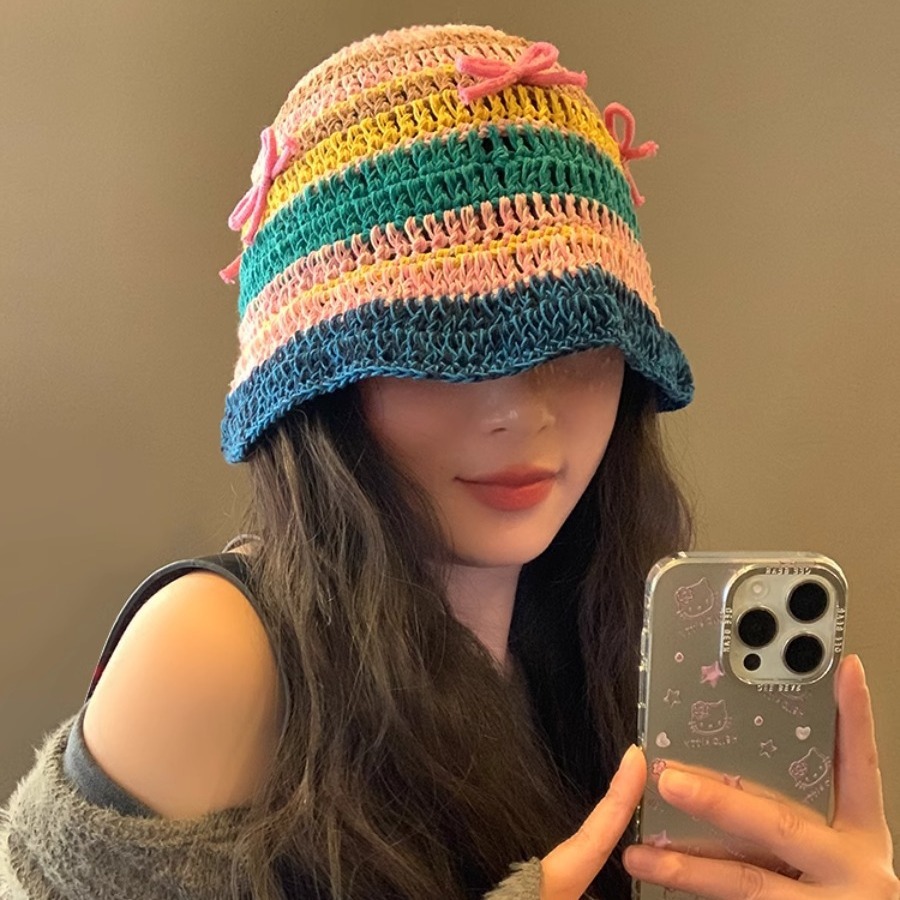 彩色编织蝴蝶结渔夫帽女夏新款韩版显脸小出游防晒遮阳水桶帽