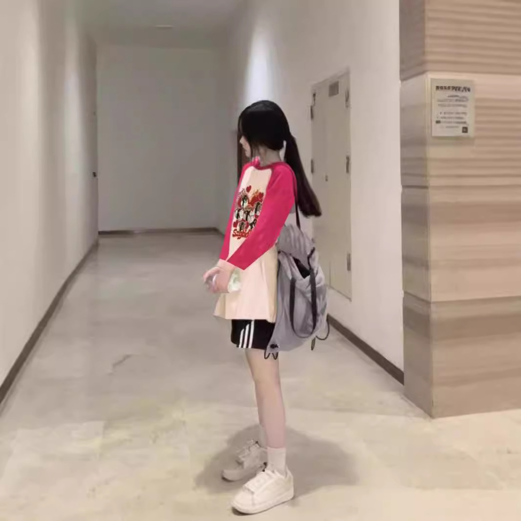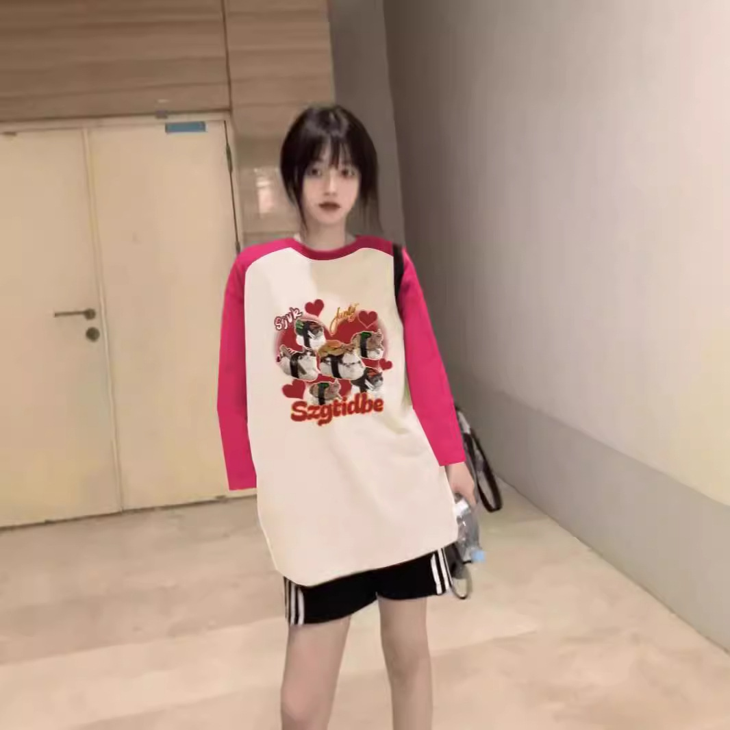 纯棉休闲插肩长袖t恤女春秋宽松大码胖妹妹mm200斤上衣潮