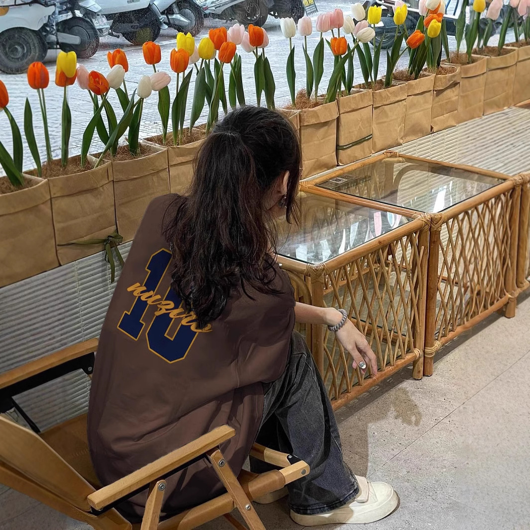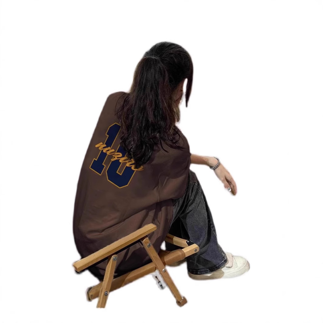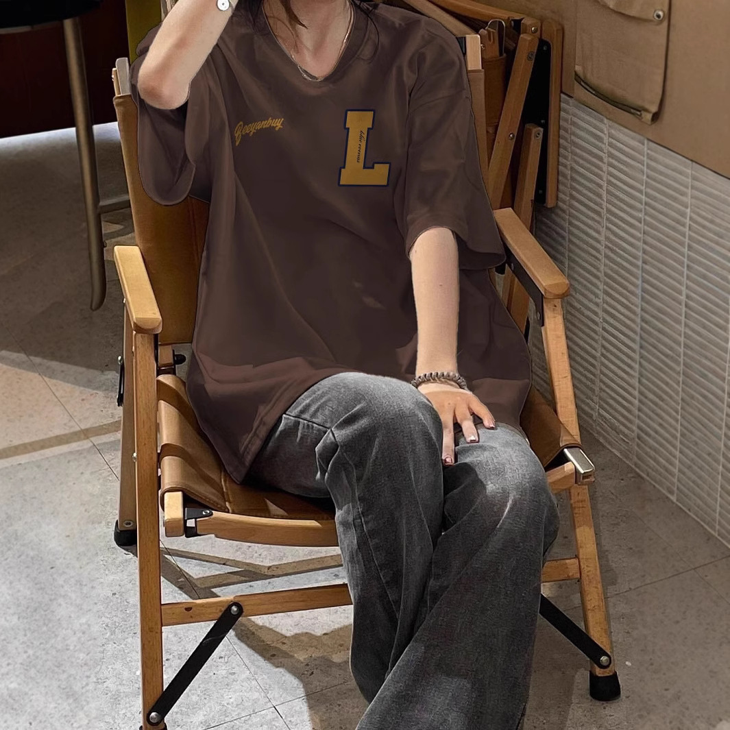 美式复古咖啡色纯棉t恤女短袖夏季宽松大码oversize情侣半袖上衣
