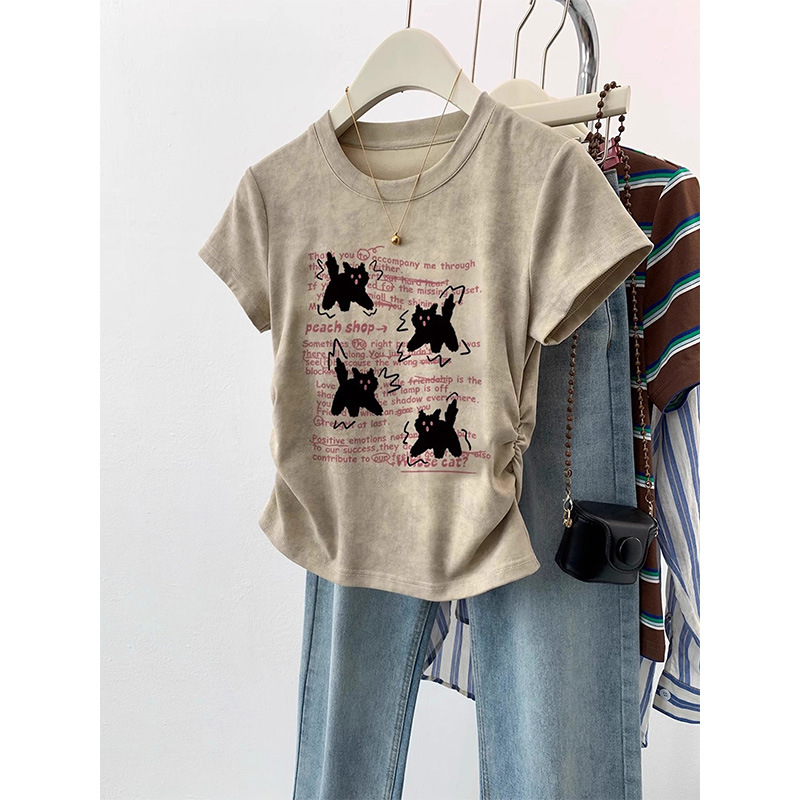纯棉扎染猫咪印花正肩短袖t恤女夏季新款小个子短款修身上衣
