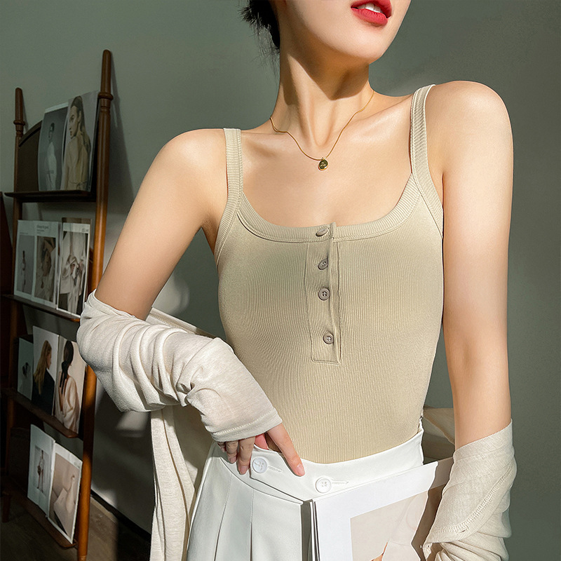 纽扣半开领吊带带胸垫女内搭修身显瘦短款齐腰法式美背小背心外穿