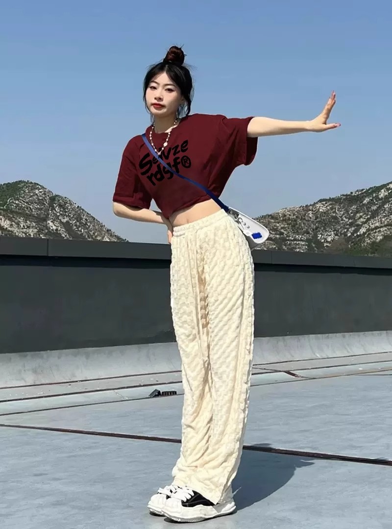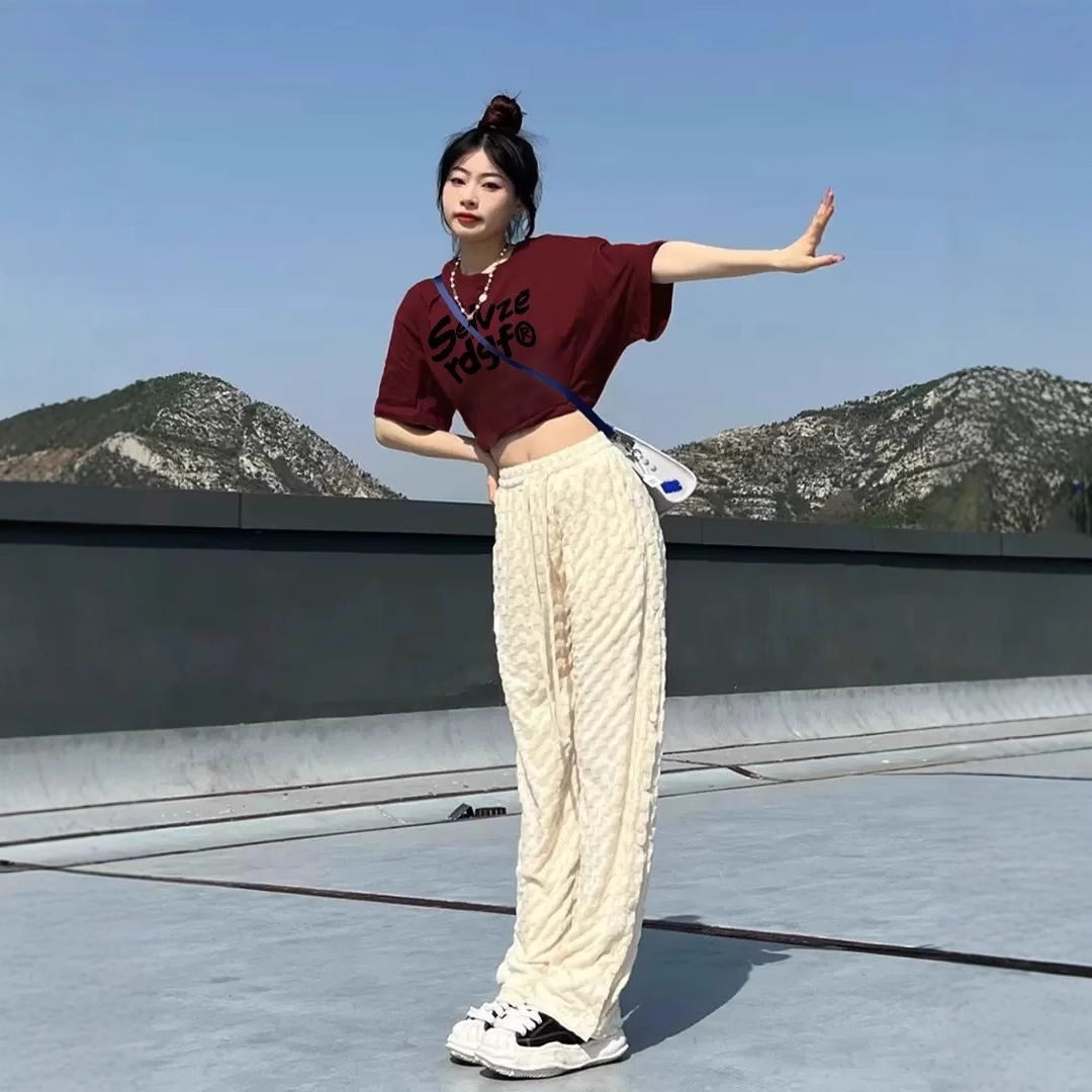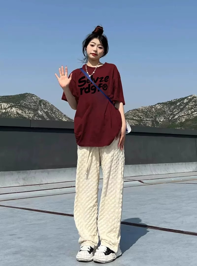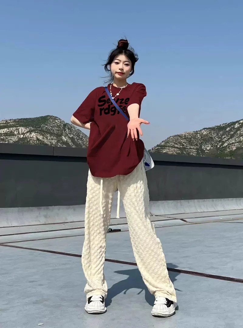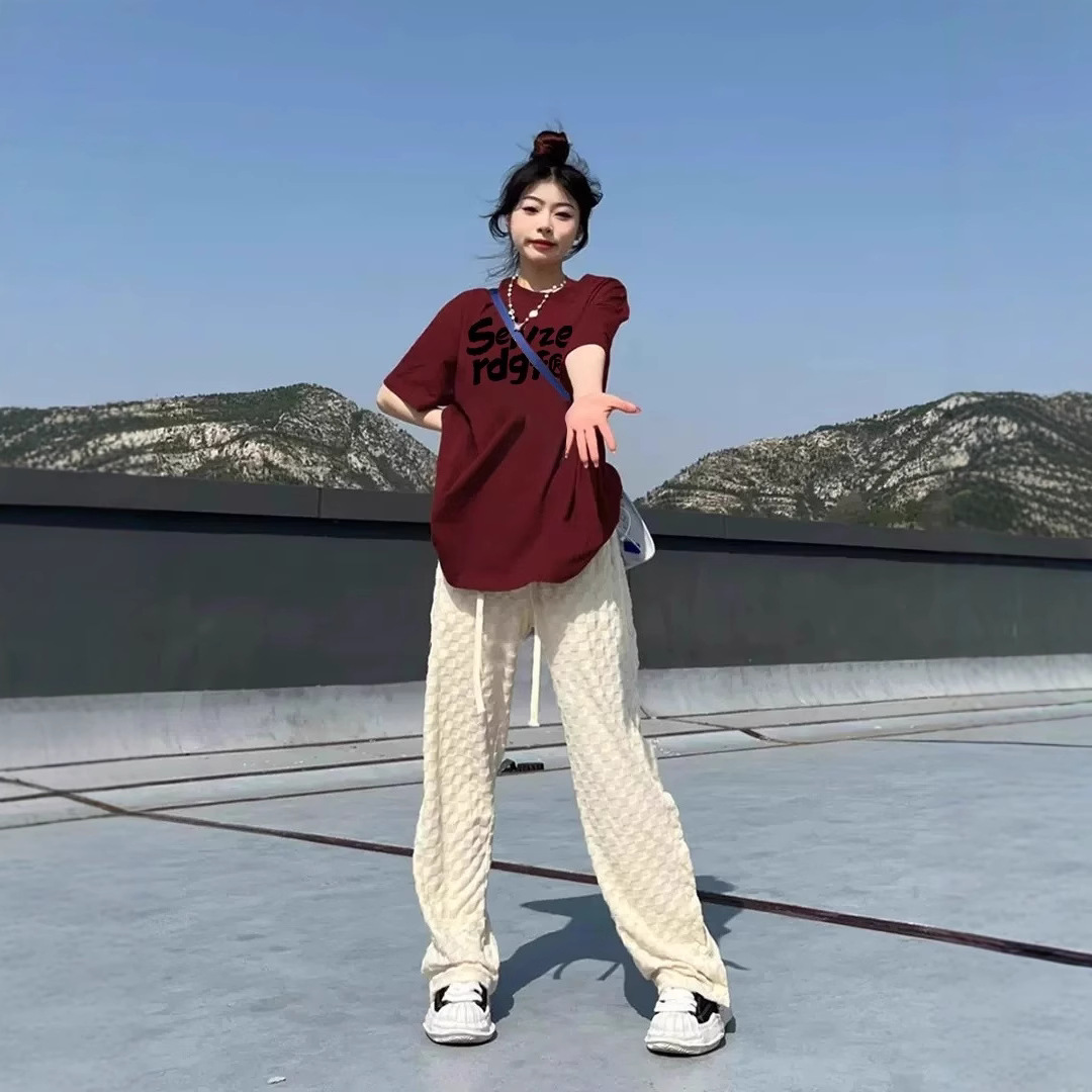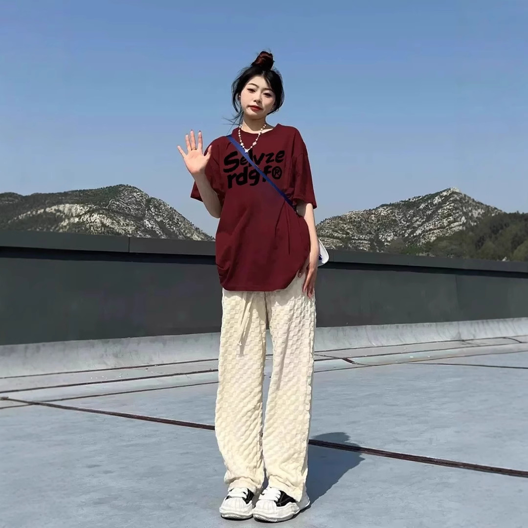 酒红色短袖t恤女夏季新款oversize小众港味复古宽松胖mm200斤上衣