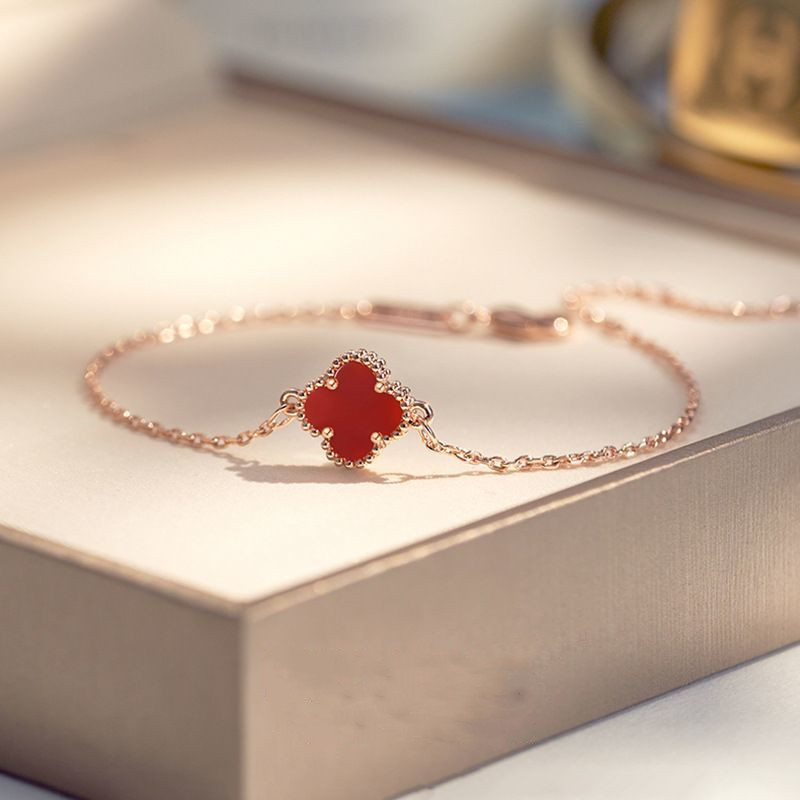高版四叶草单花手链女v金小众潮流镀18K玫瑰金双面红迷你百搭女款