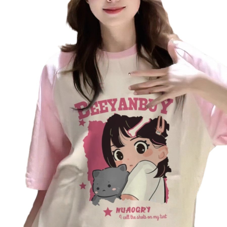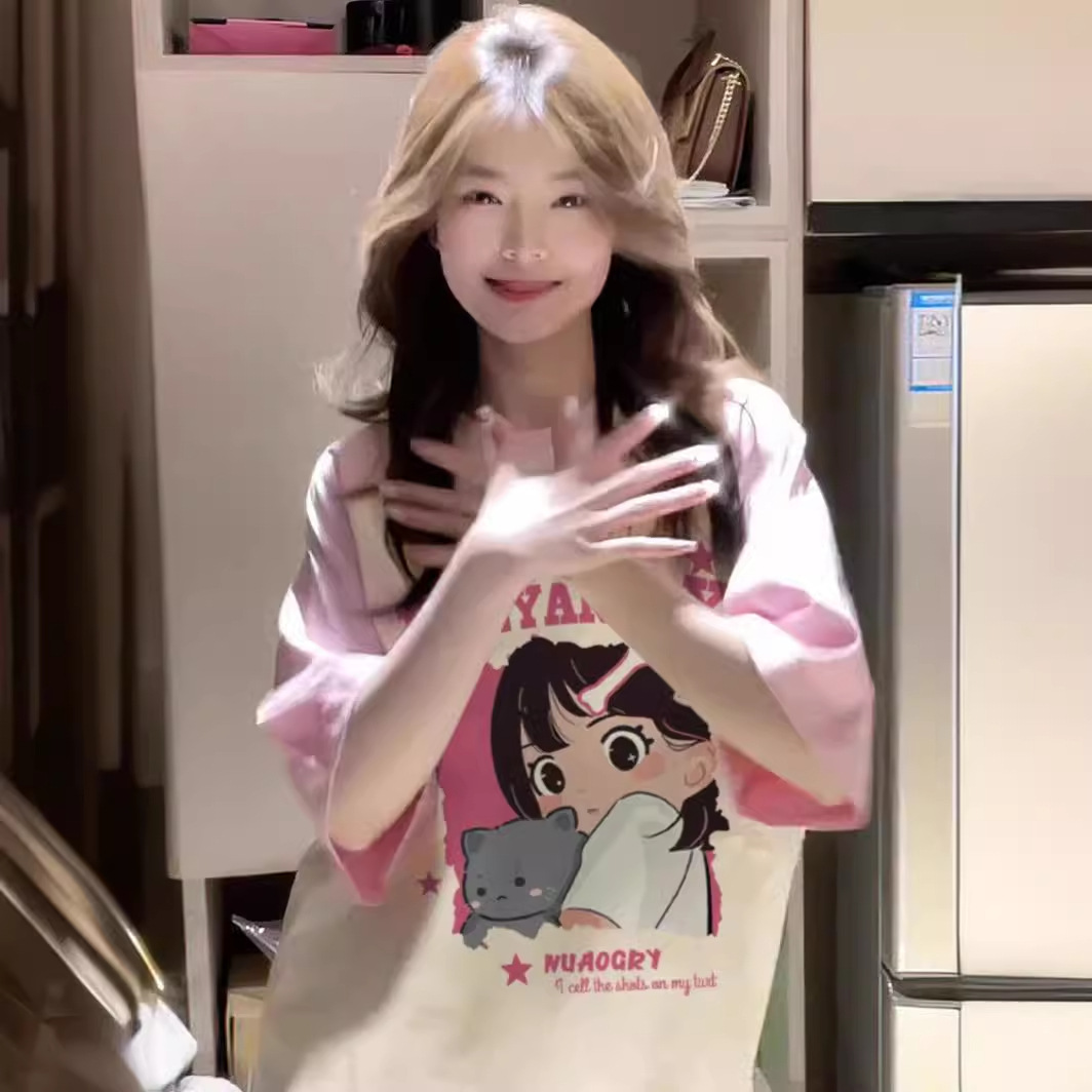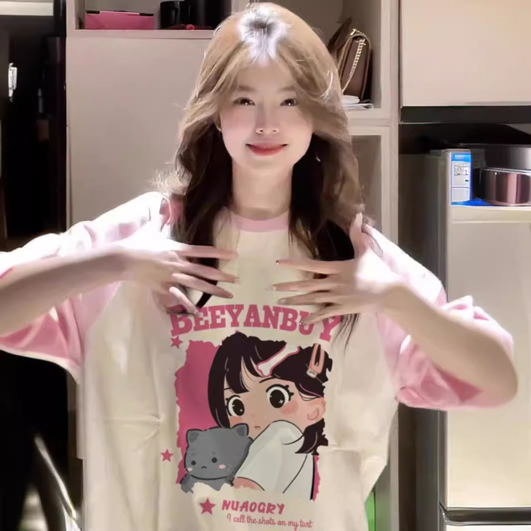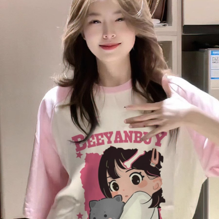 粉色插肩袖短袖t恤女新款夏天多巴胺甜妹穿搭设计感纯棉上衣