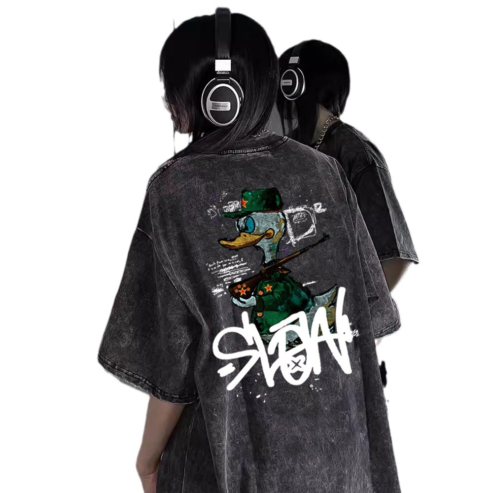纯棉夏季ins潮牌百搭趣味卡通短袖打底衫宽松休闲水洗做旧T恤男女