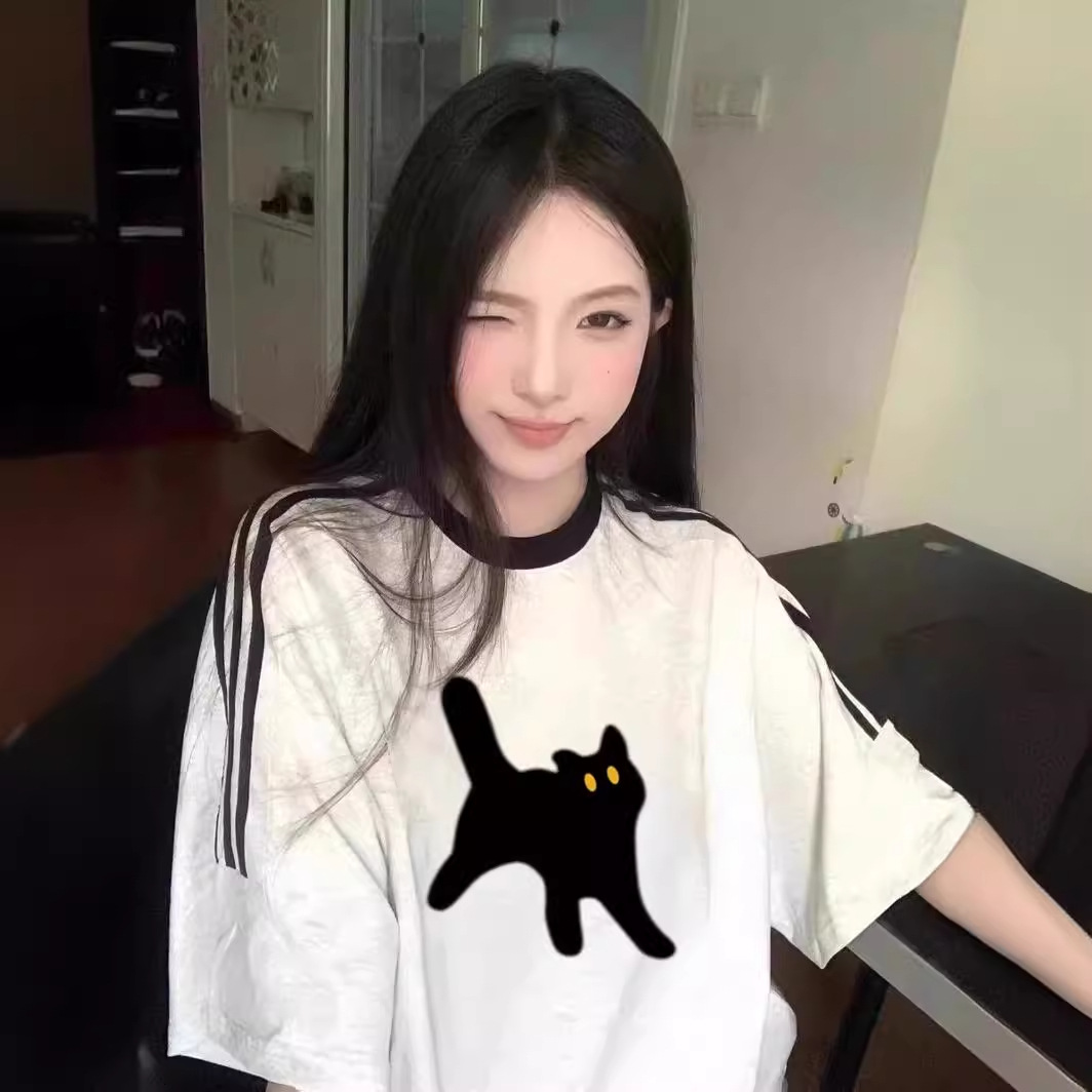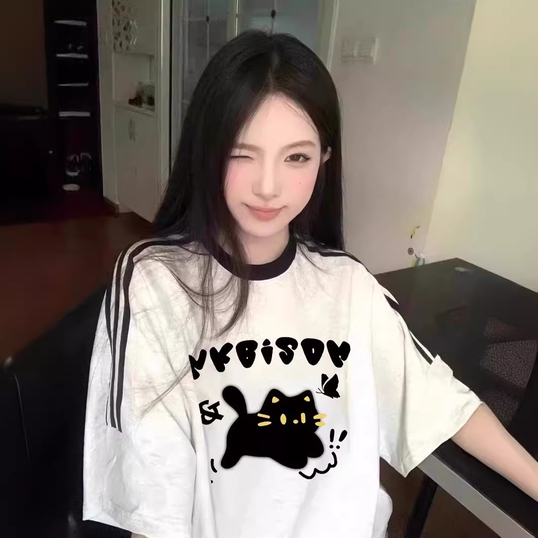 纯棉美式复古正肩白灰t恤女夏季短袖宽松大版情侣半袖三条杠上衣