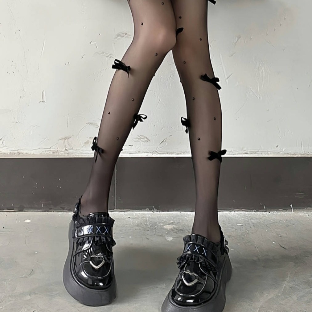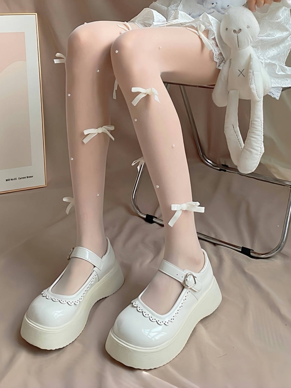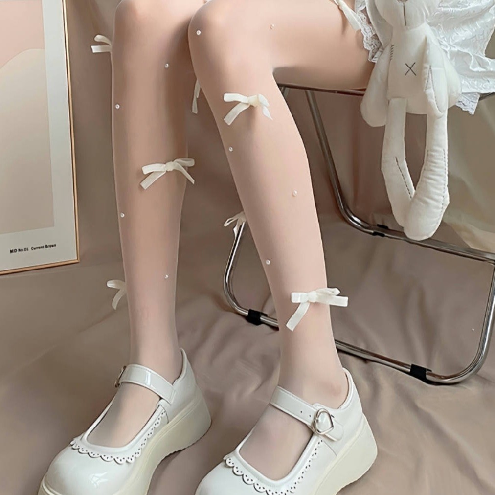 蝴蝶结白色丝袜女夏季薄款防勾丝袜lolita洛丽塔纯欲珍珠黑色丝袜