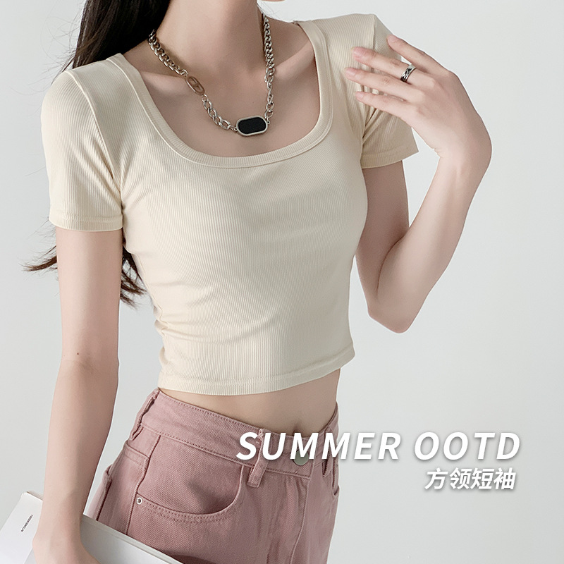 方领正肩短袖女夏季新款漏腰背心短款t恤打底衫外穿白色上衣