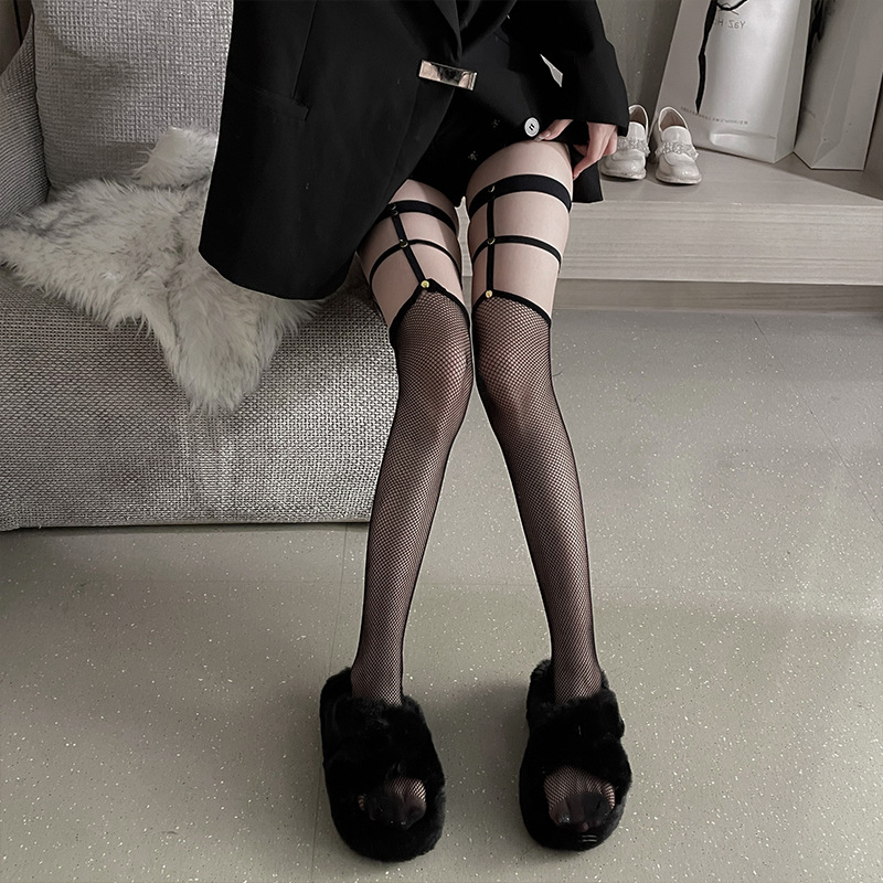 铆钉过膝袜女镂空渔网袜长筒吊带丝袜暗黑朋克性感黑丝吊带袜
