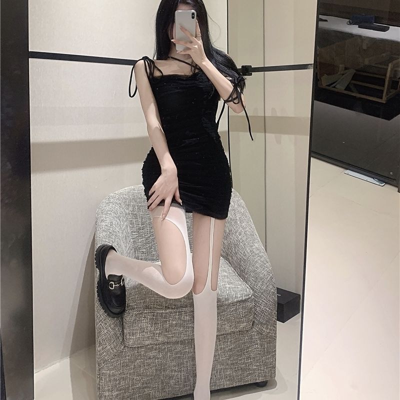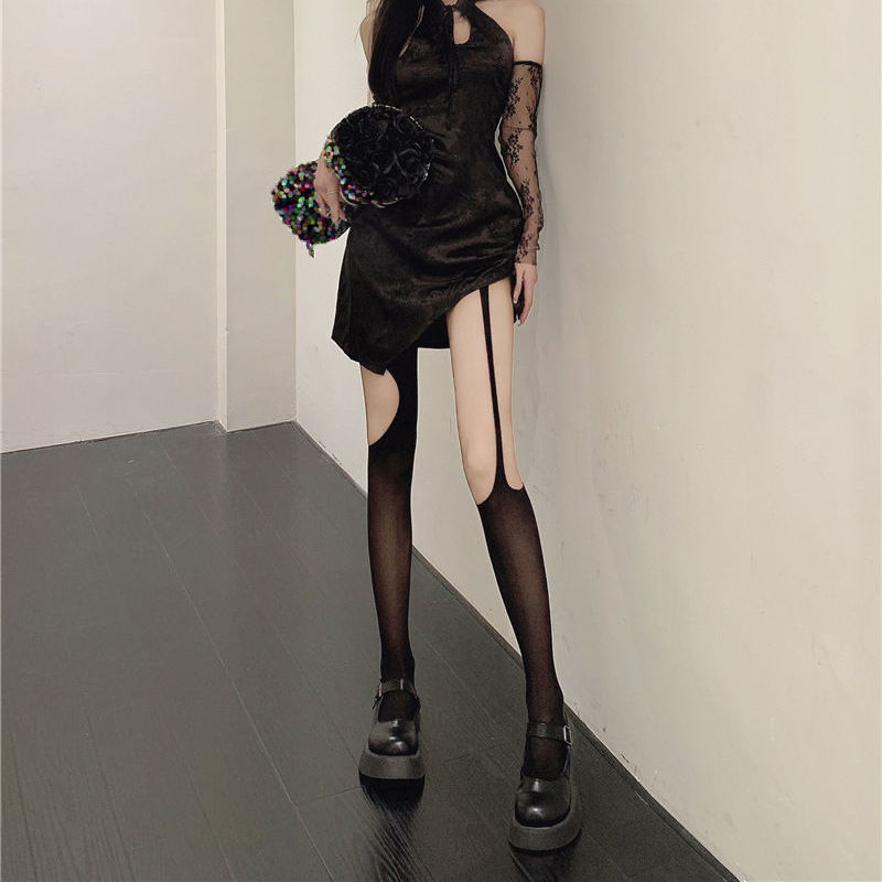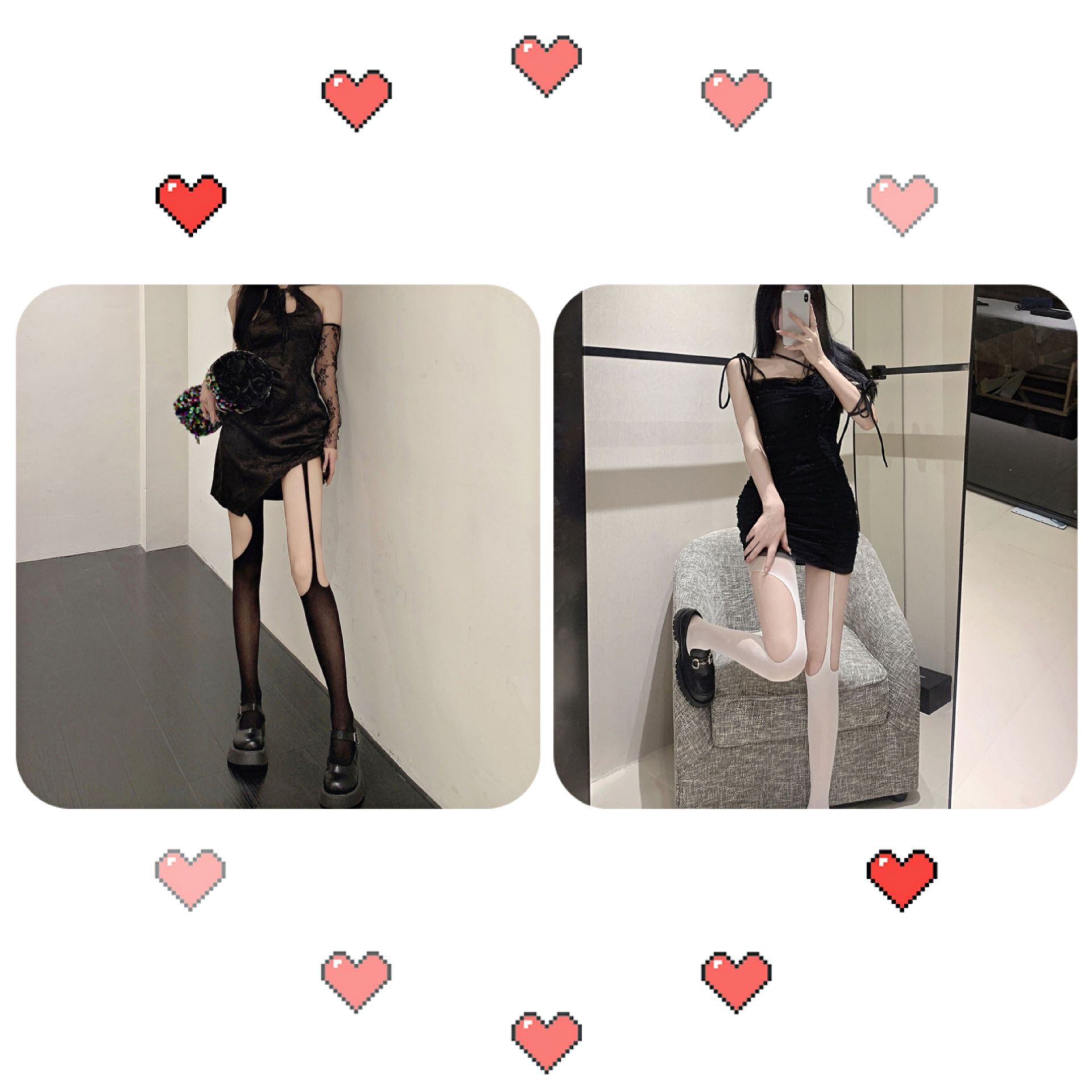 不对称吊带黑丝袜女性感破洞镂空辣妹美腿个性黑色纯欲一体连裤袜