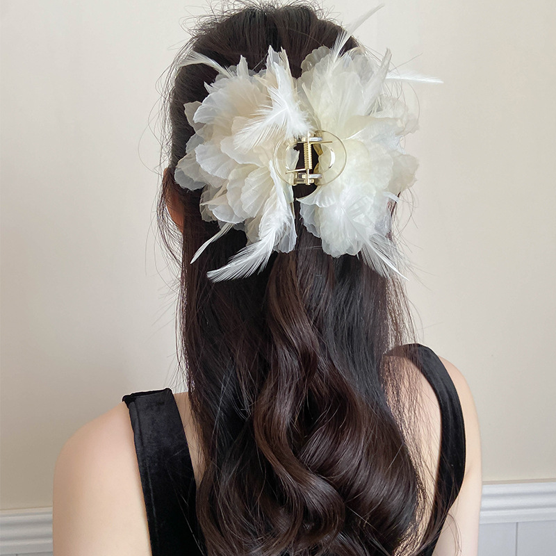 新款鲨鱼夹花朵羽毛抓夹高级感发夹后脑勺毛毛发抓超仙头饰品