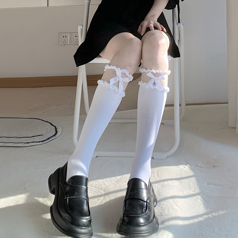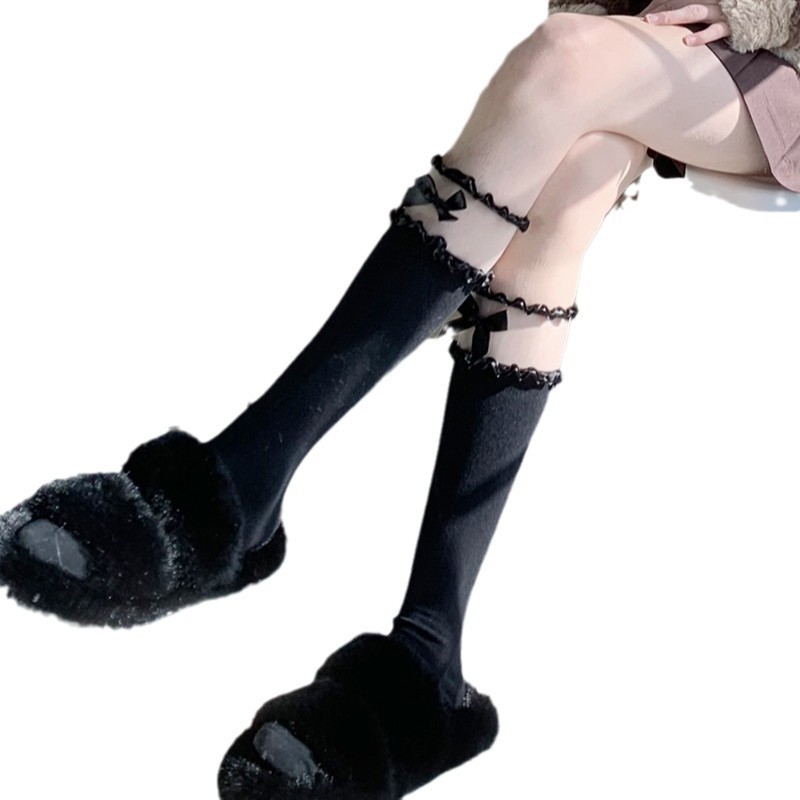 日系黑色jk小腿袜子女春秋可爱洛丽塔蝴蝶结花边中筒玛丽珍蕾丝袜