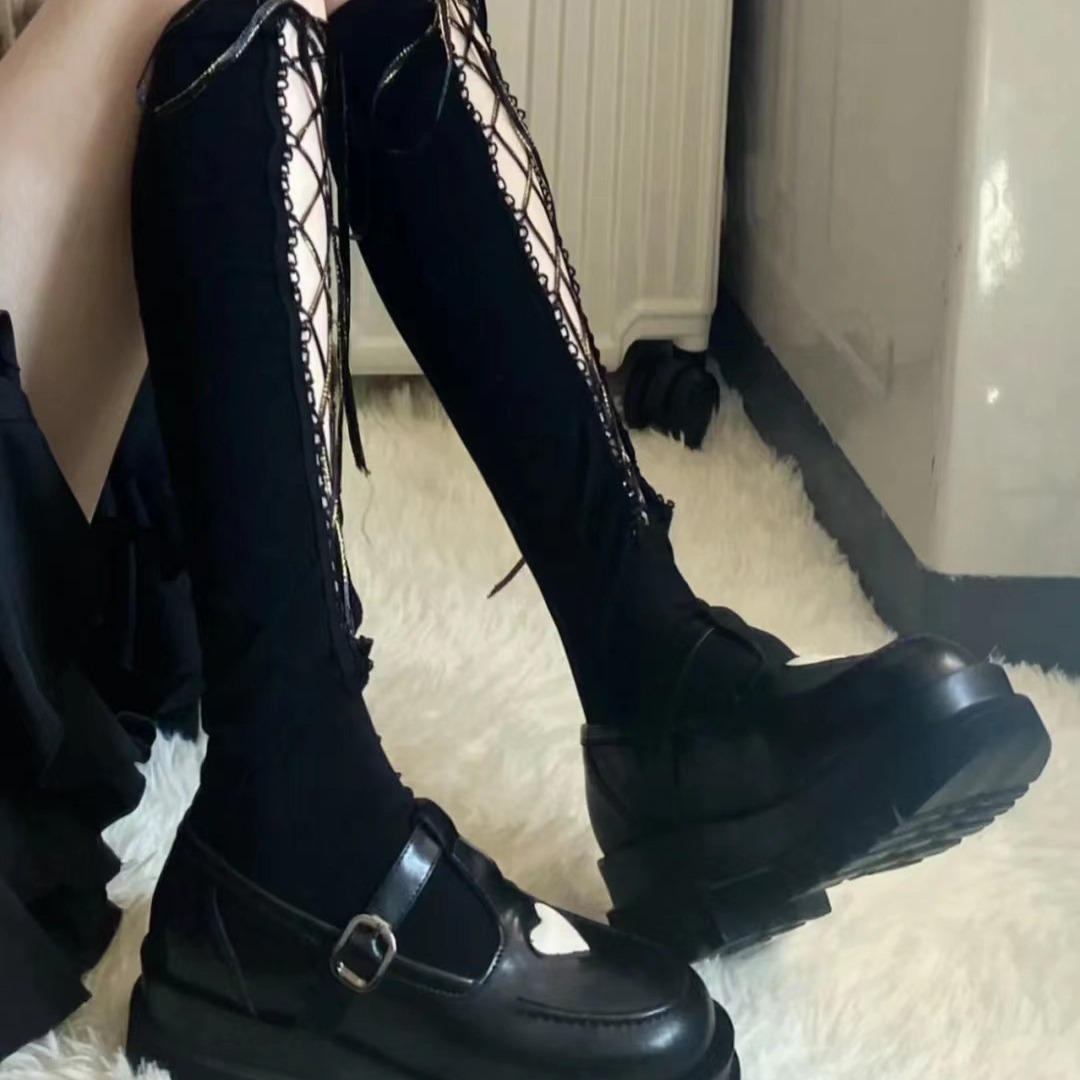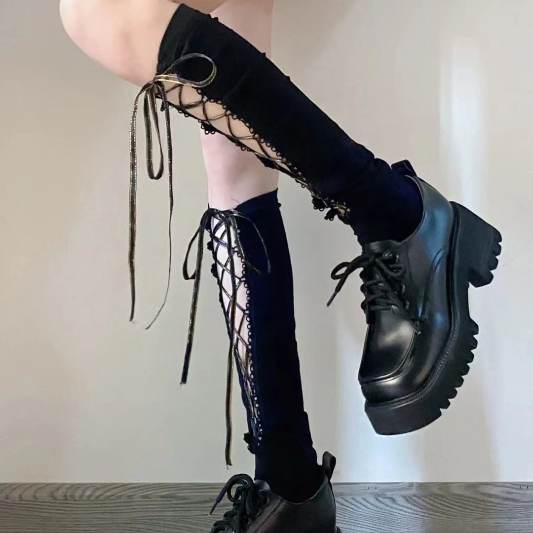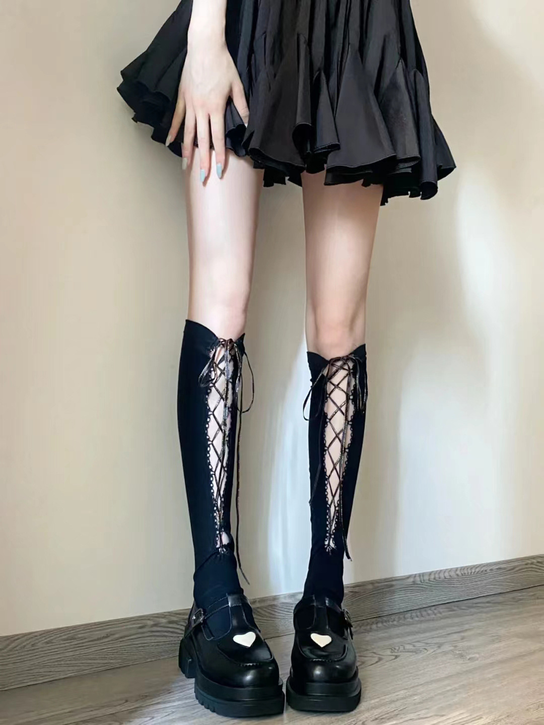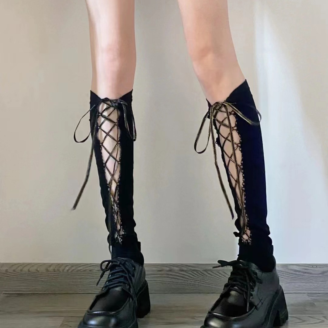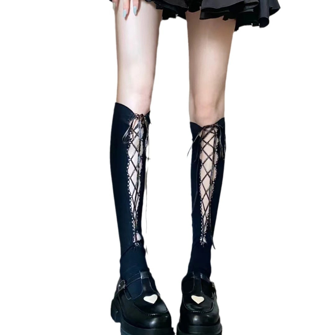 日系黑色性感交叉绑带镂空小腿袜女春夏季款jk辣妹中筒lolita袜子