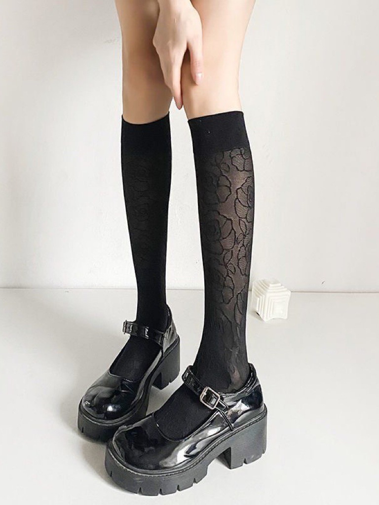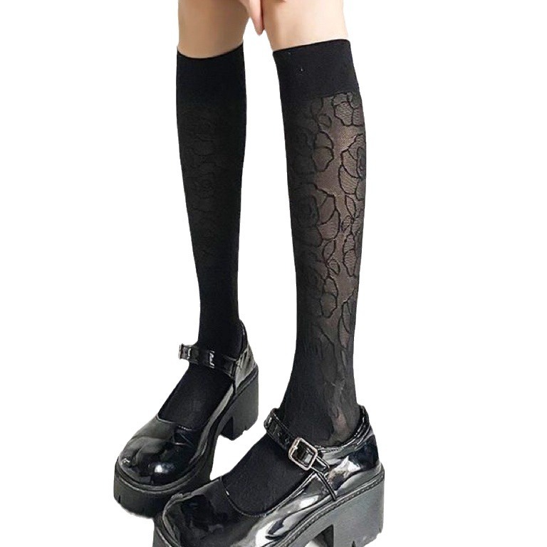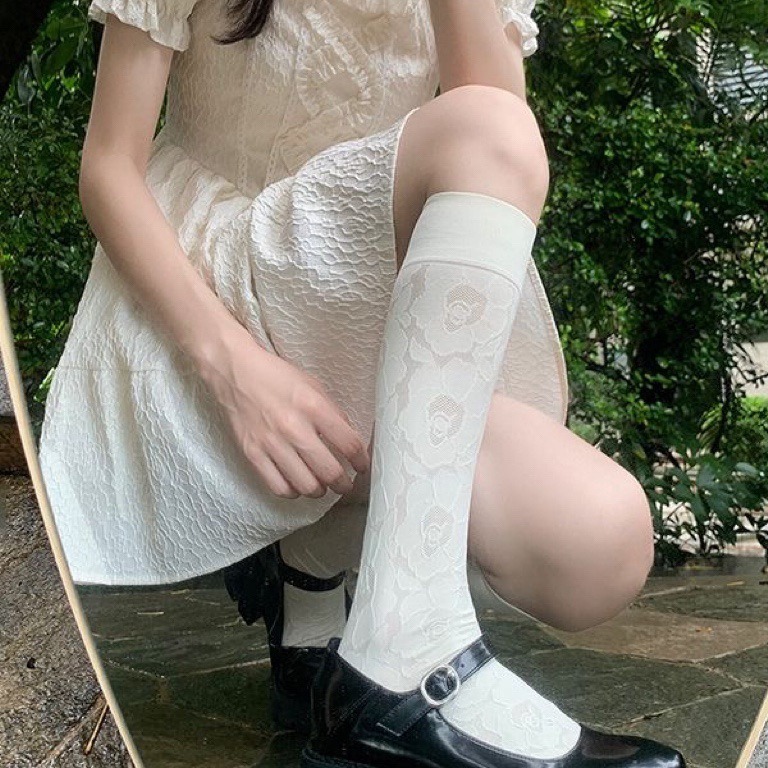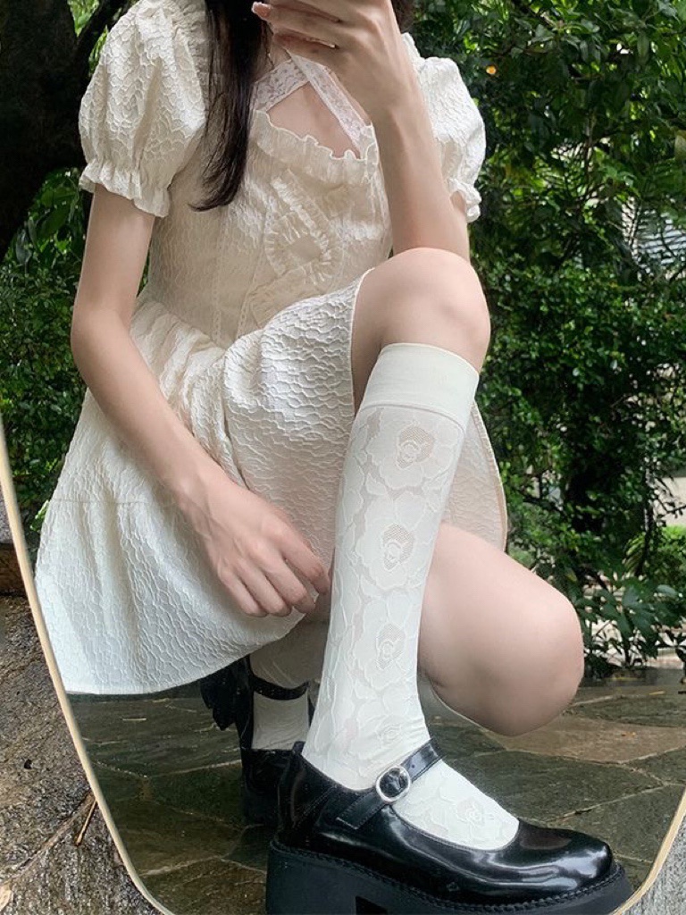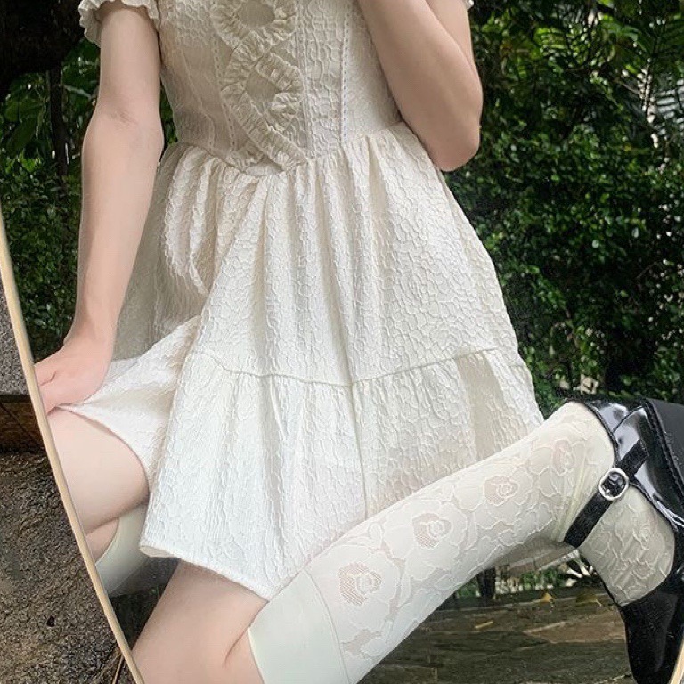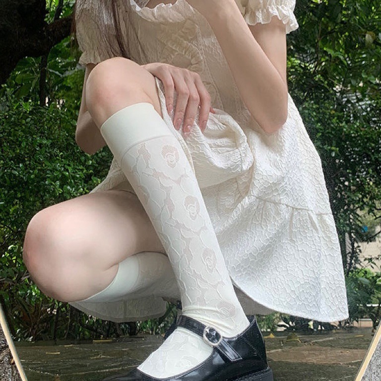 白色蕾丝小腿袜子女夏季薄款半腿中筒jk洛丽塔玫瑰花朵lolita袜子