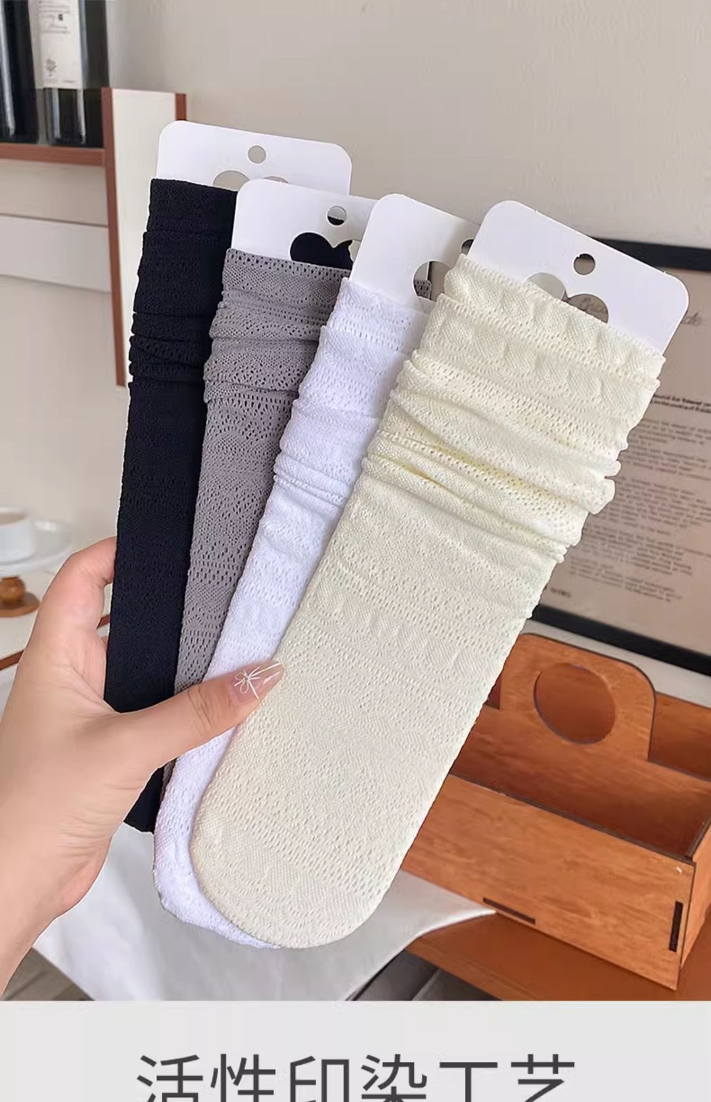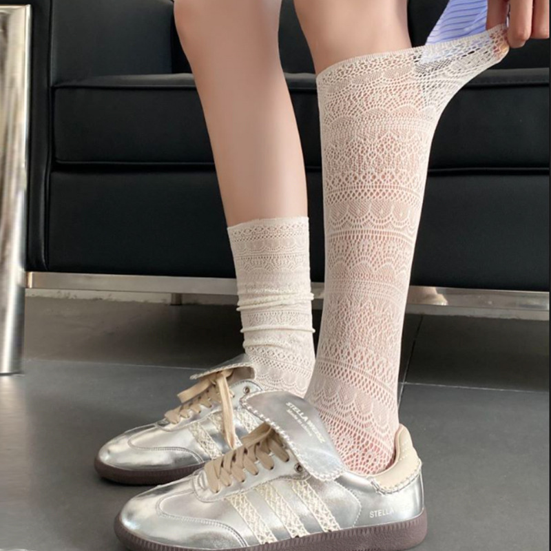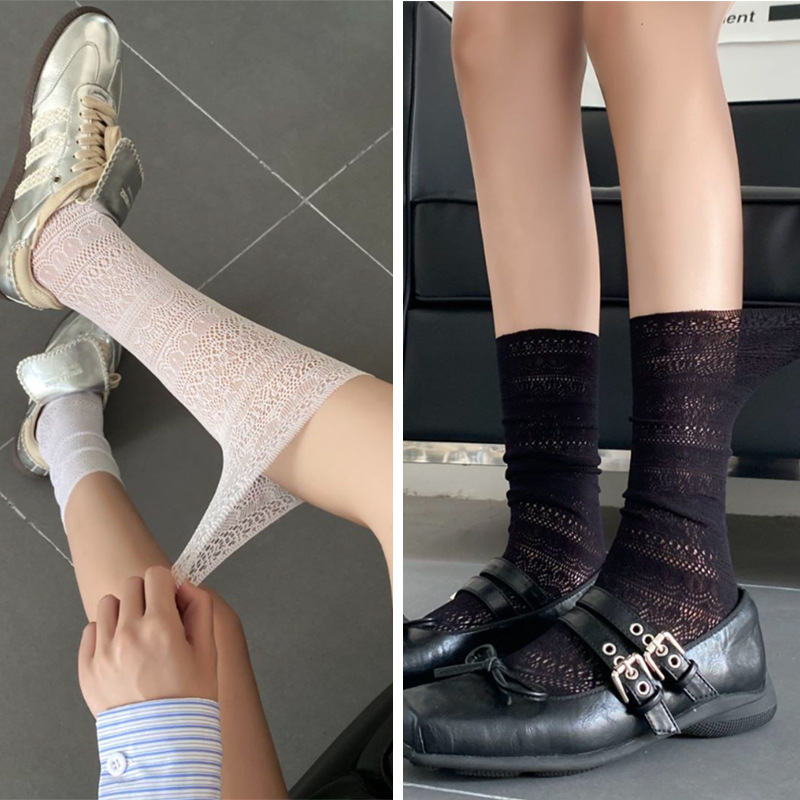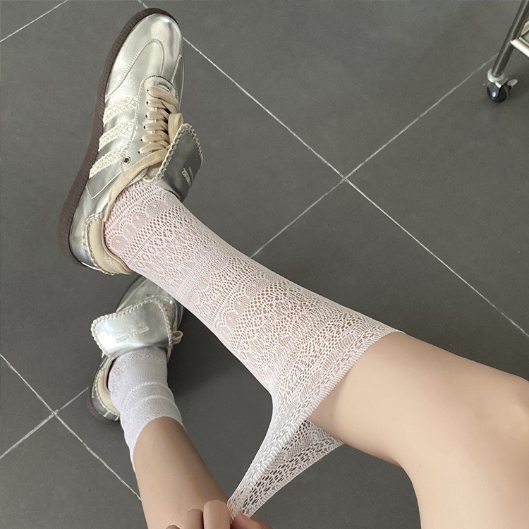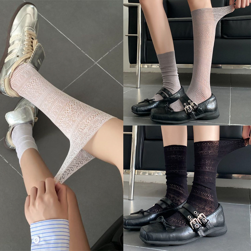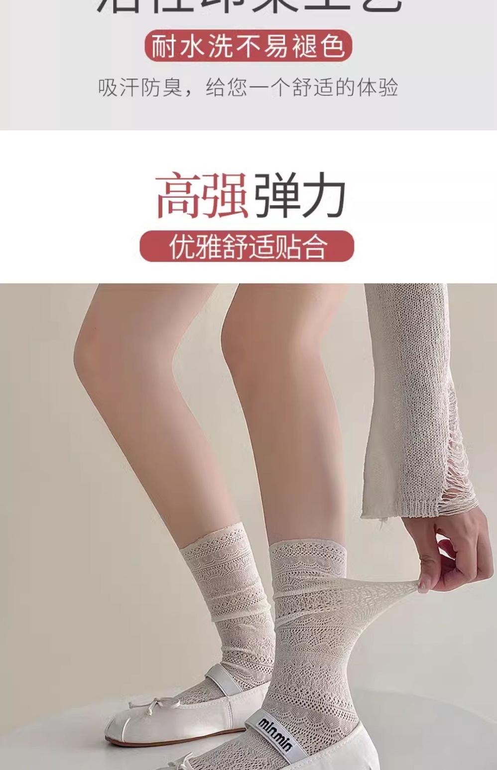 白色堆堆袜子女夏季薄款镂空网眼中筒袜配小皮鞋芭蕾风蕾丝小腿袜