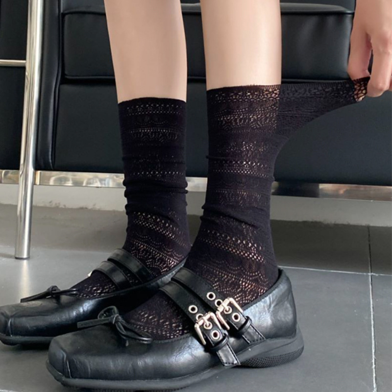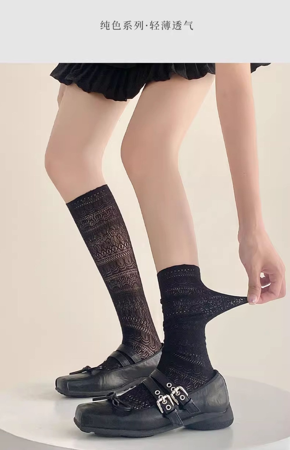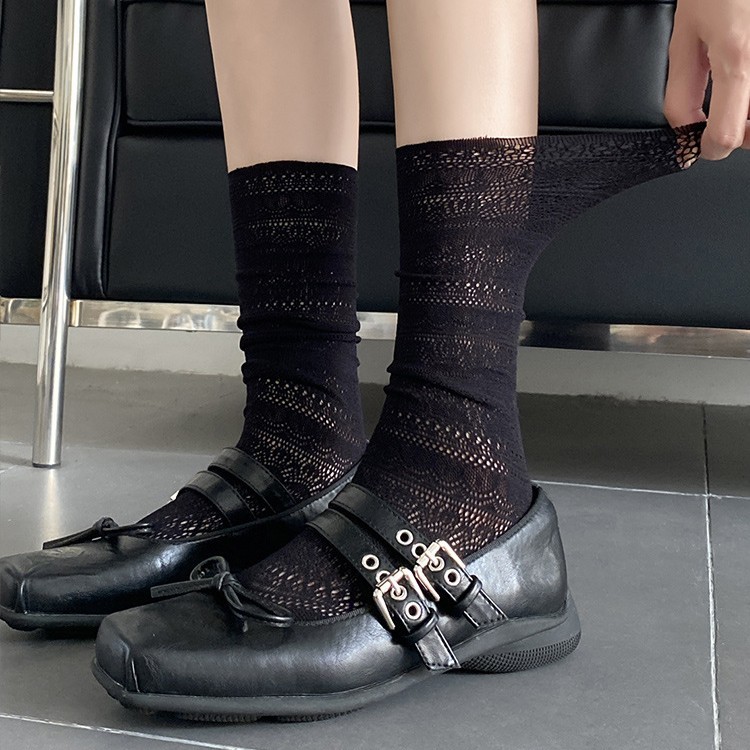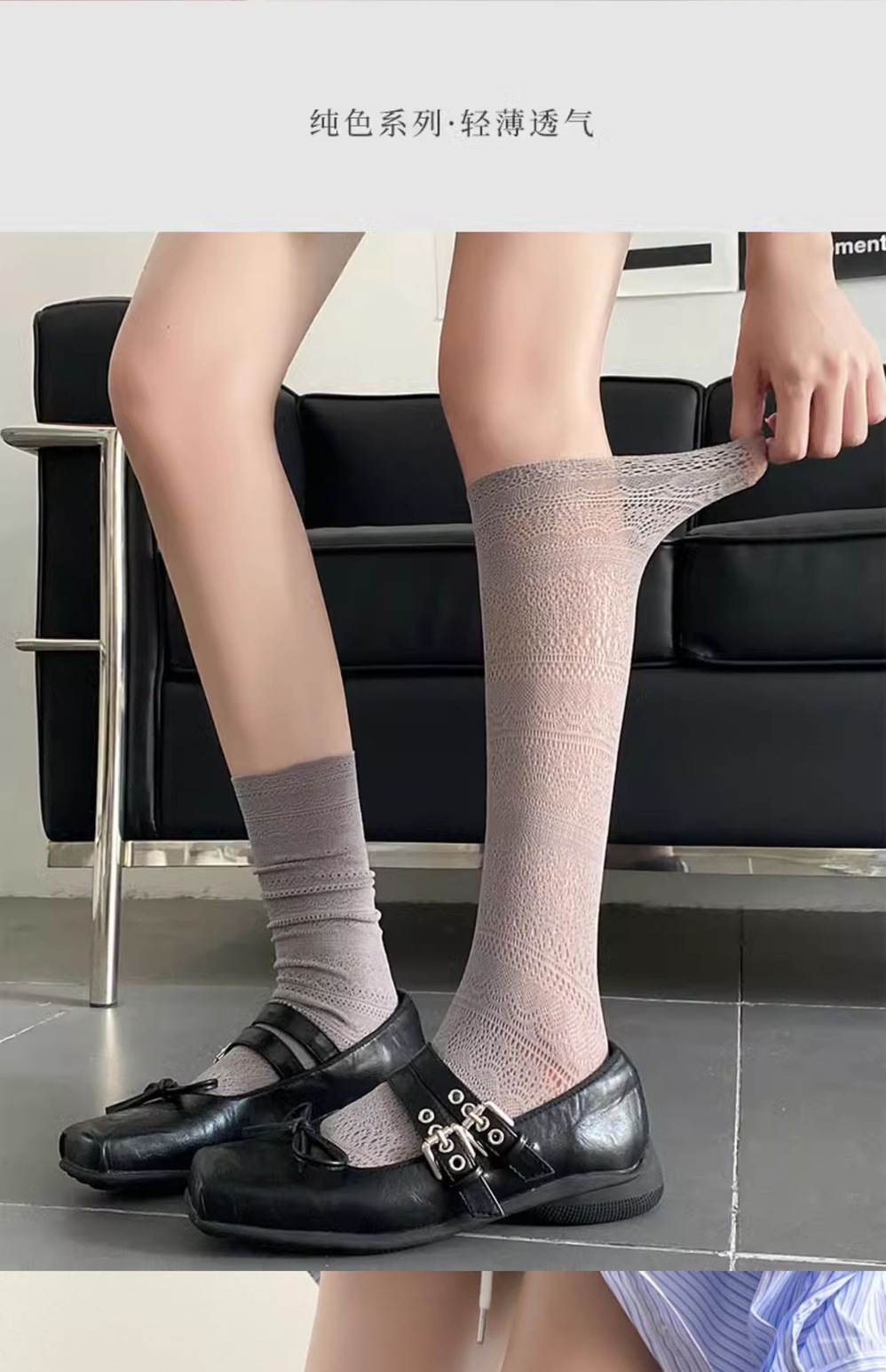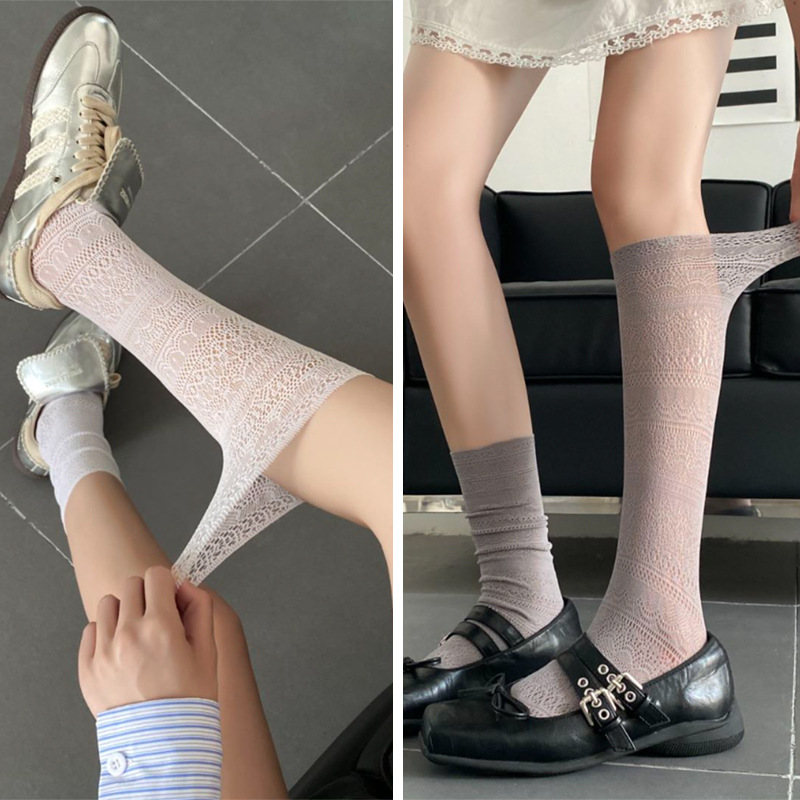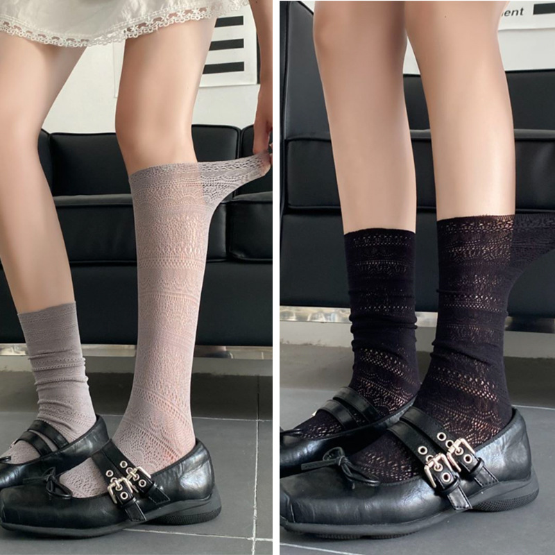 白色堆堆袜子女夏季薄款镂空网眼中筒袜配小皮鞋芭蕾风蕾丝小腿袜