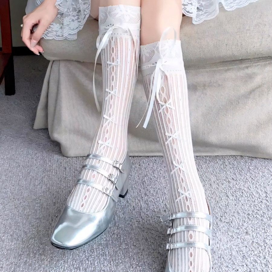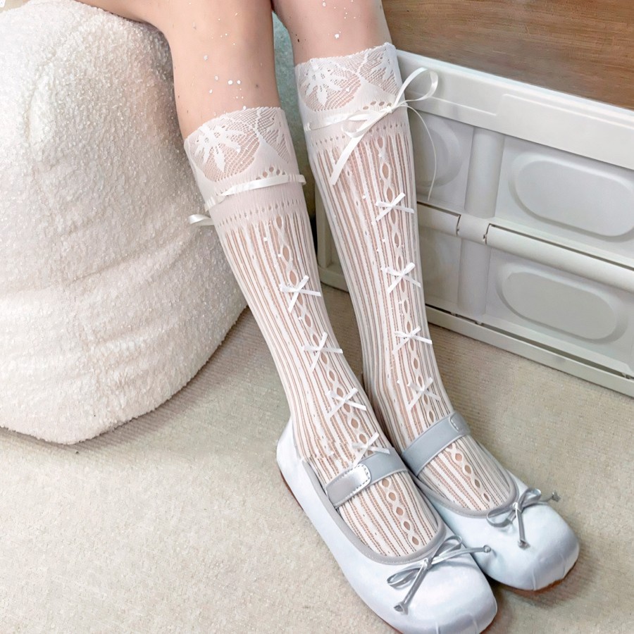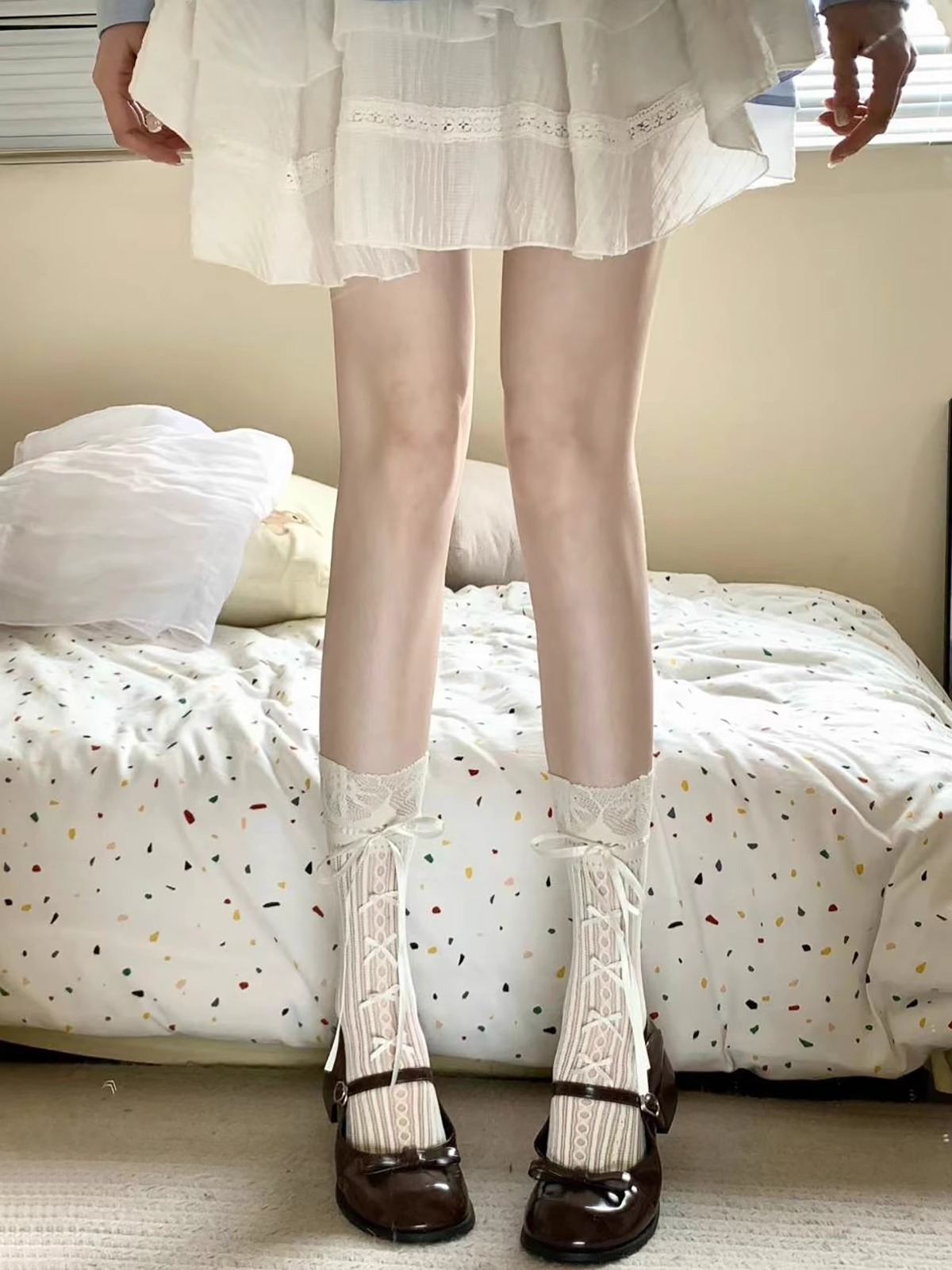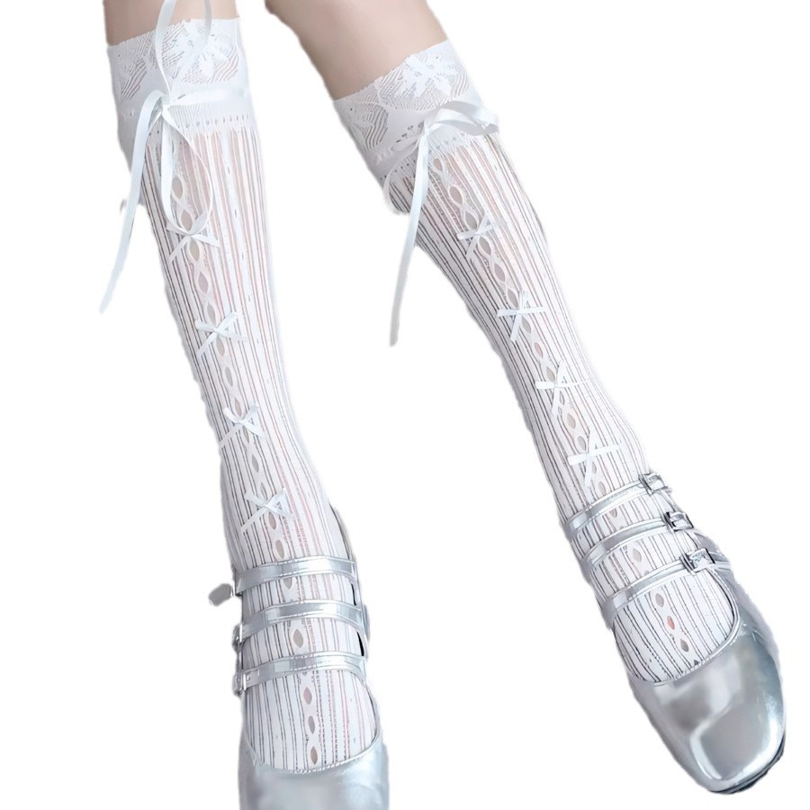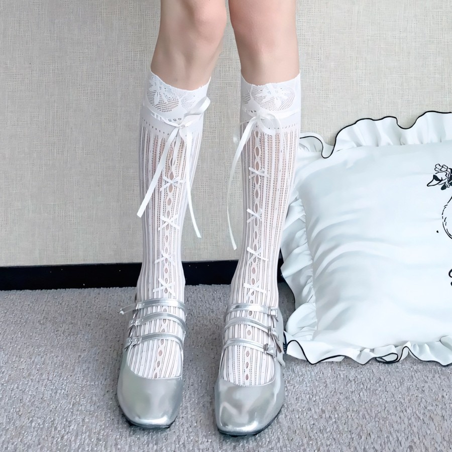 镂空白色蕾丝带蝴蝶结中筒袜子玛丽珍女夏季薄款绑带小腿堆堆网袜