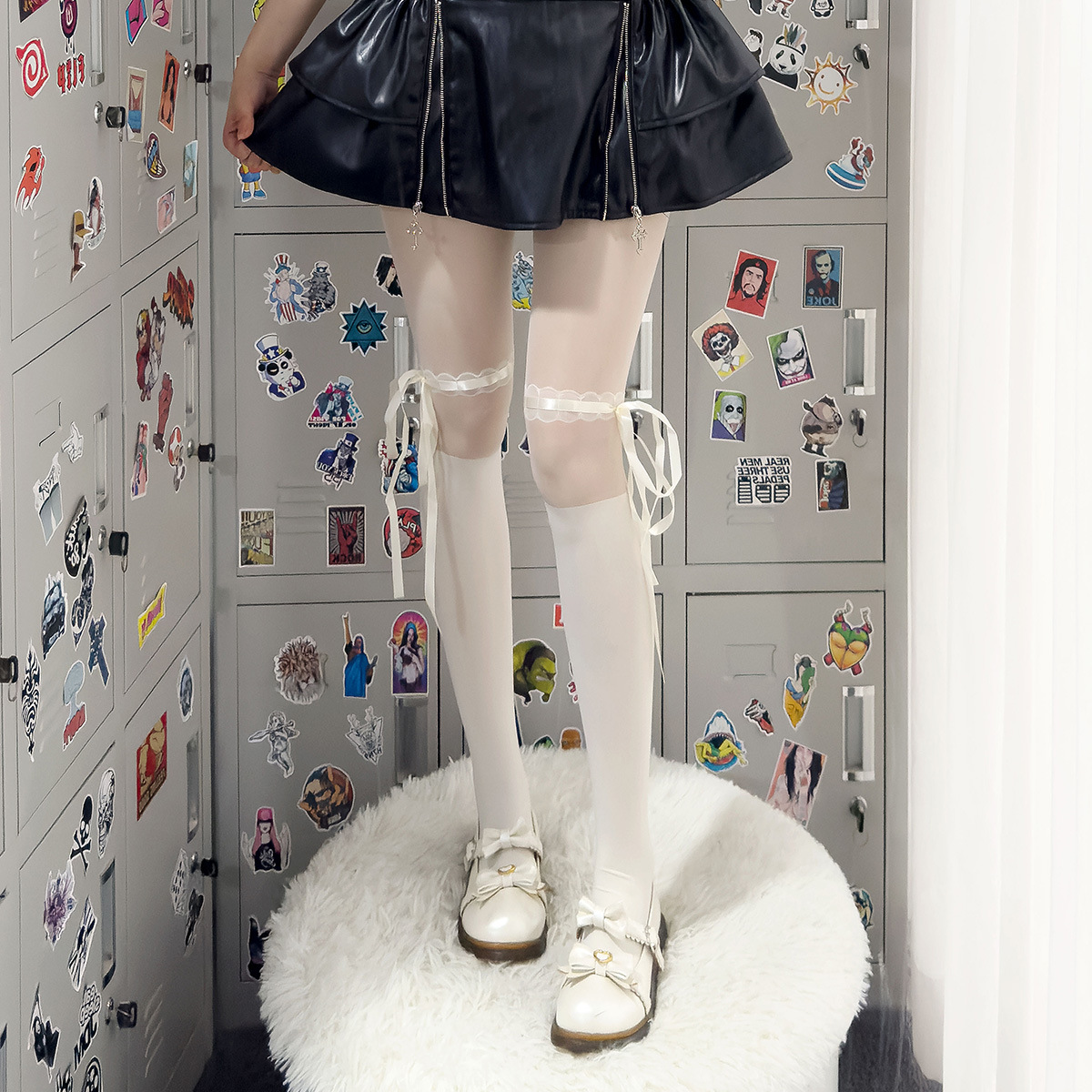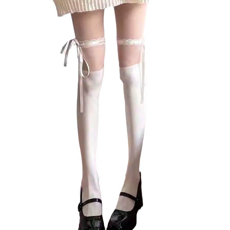 绑带蝴蝶结花边黑白丝袜春夏薄款百搭蕾丝连裤袜Lolita拼接打底袜