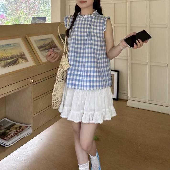 夏日田园亚麻棉蓝色细褶格子背心小衫上衣