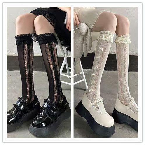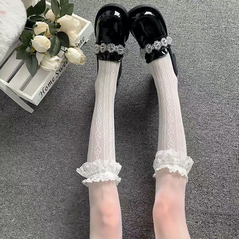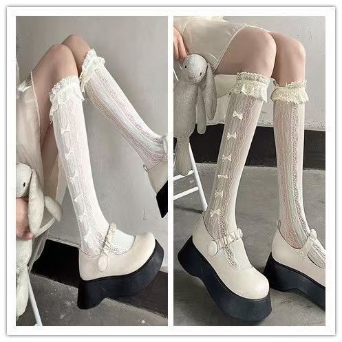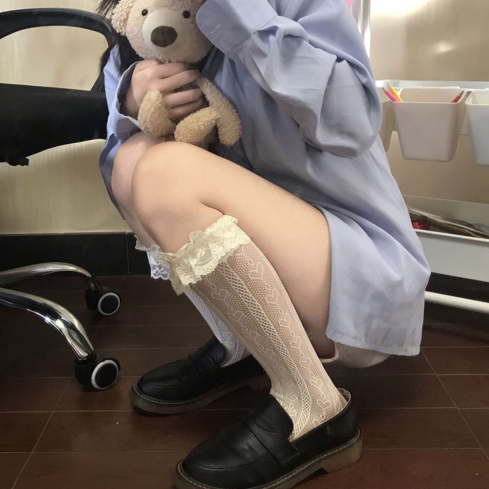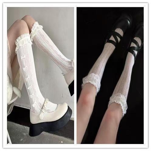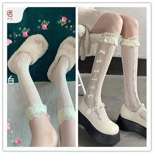 日系蕾丝袜子lolita夏秋薄款蝴蝶结中筒jk花边洛丽塔小腿袜纯欲风