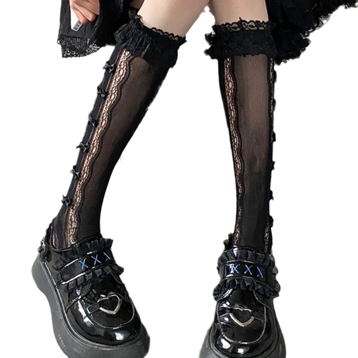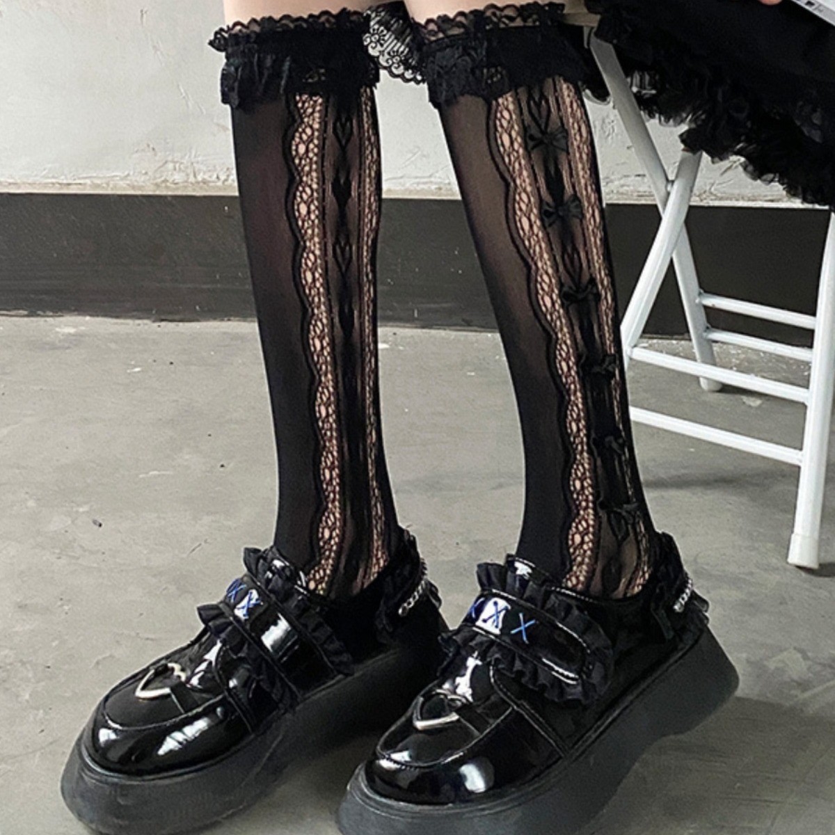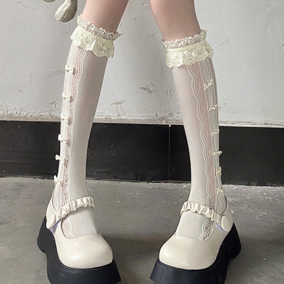 日系蕾丝袜子lolita夏秋薄款蝴蝶结中筒jk花边洛丽塔小腿袜纯欲风