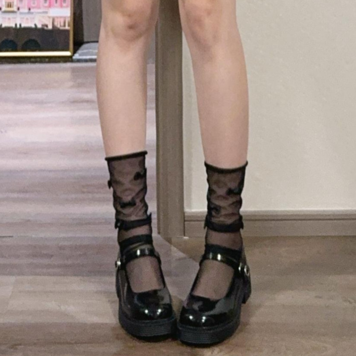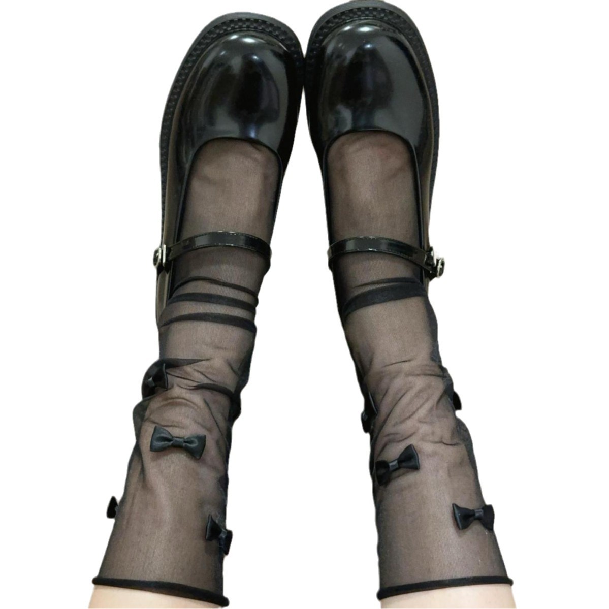 少女蝴蝶结黑色透明网纱中短筒芭蕾风蕾丝水晶玻璃丝小腿堆堆袜子