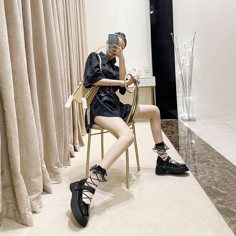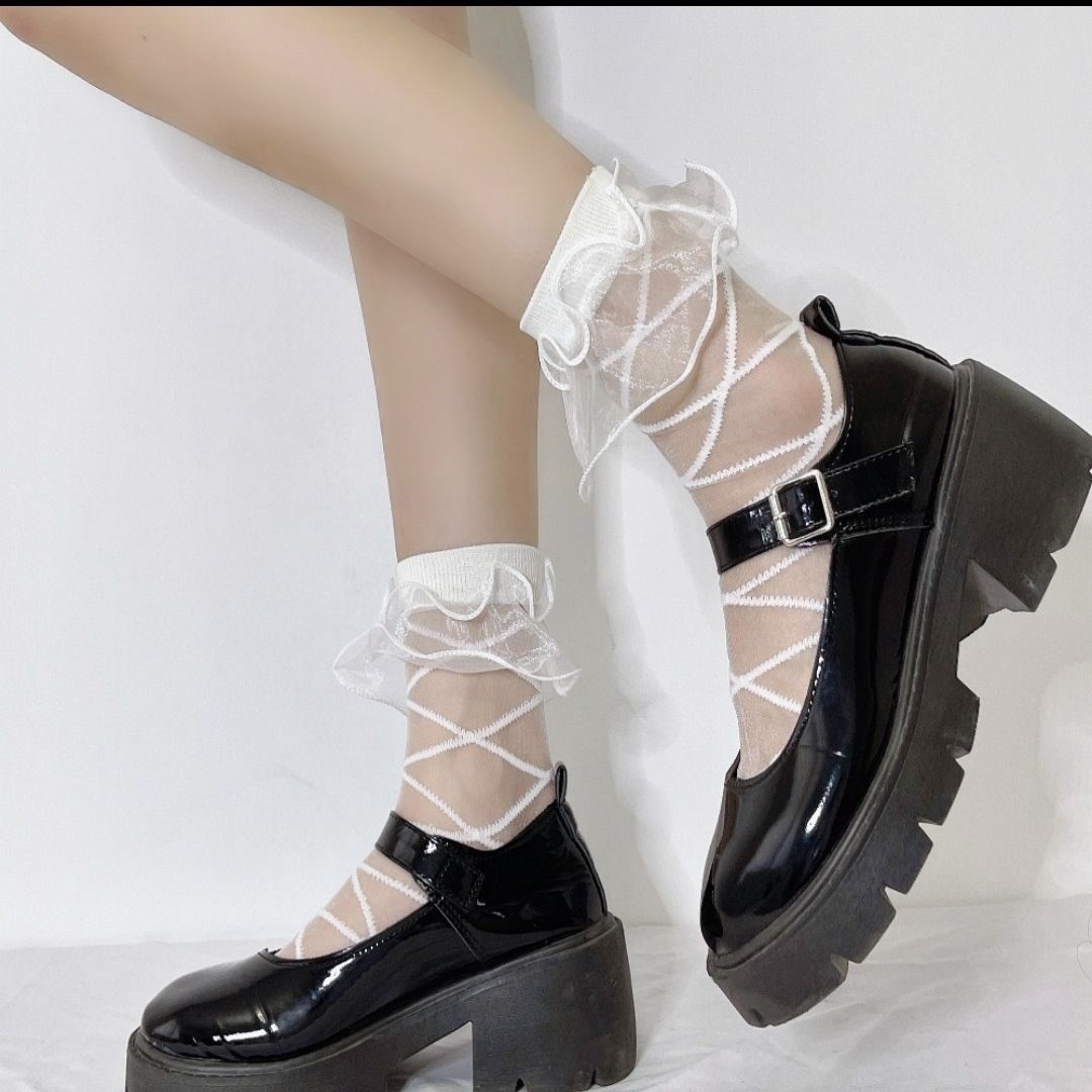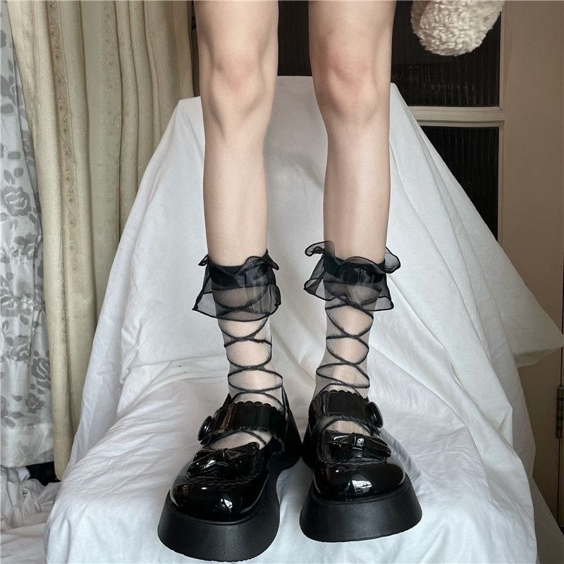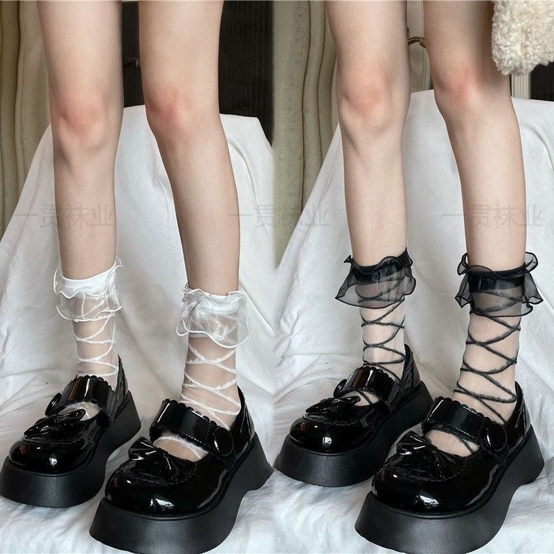 夏季薄款透明日系可爱交叉纹路木耳边黑白色学院风JK玻璃丝袜少女