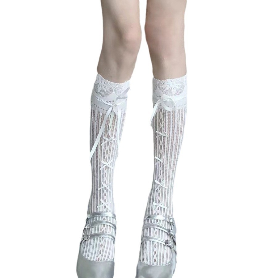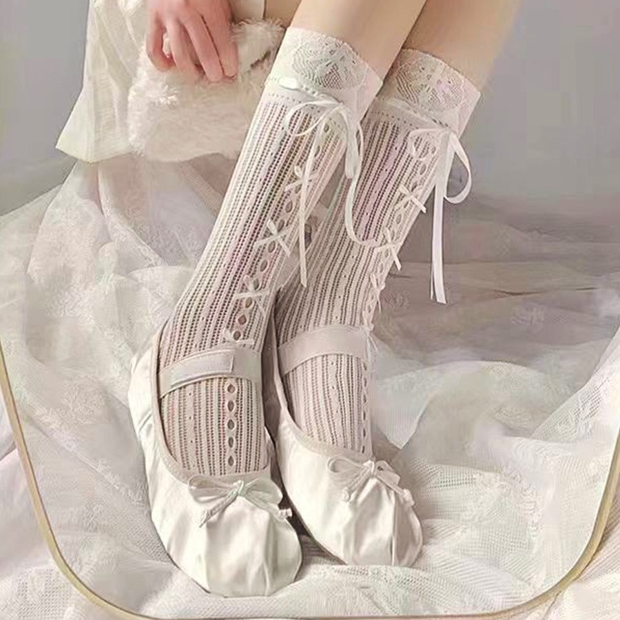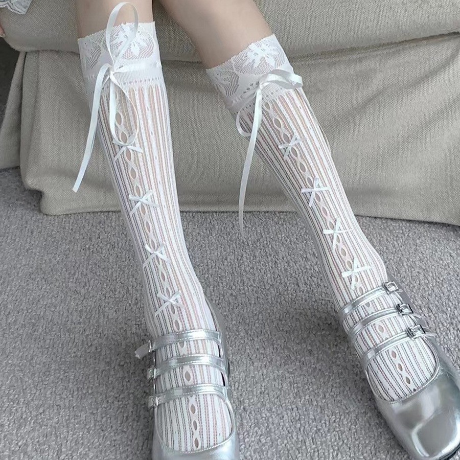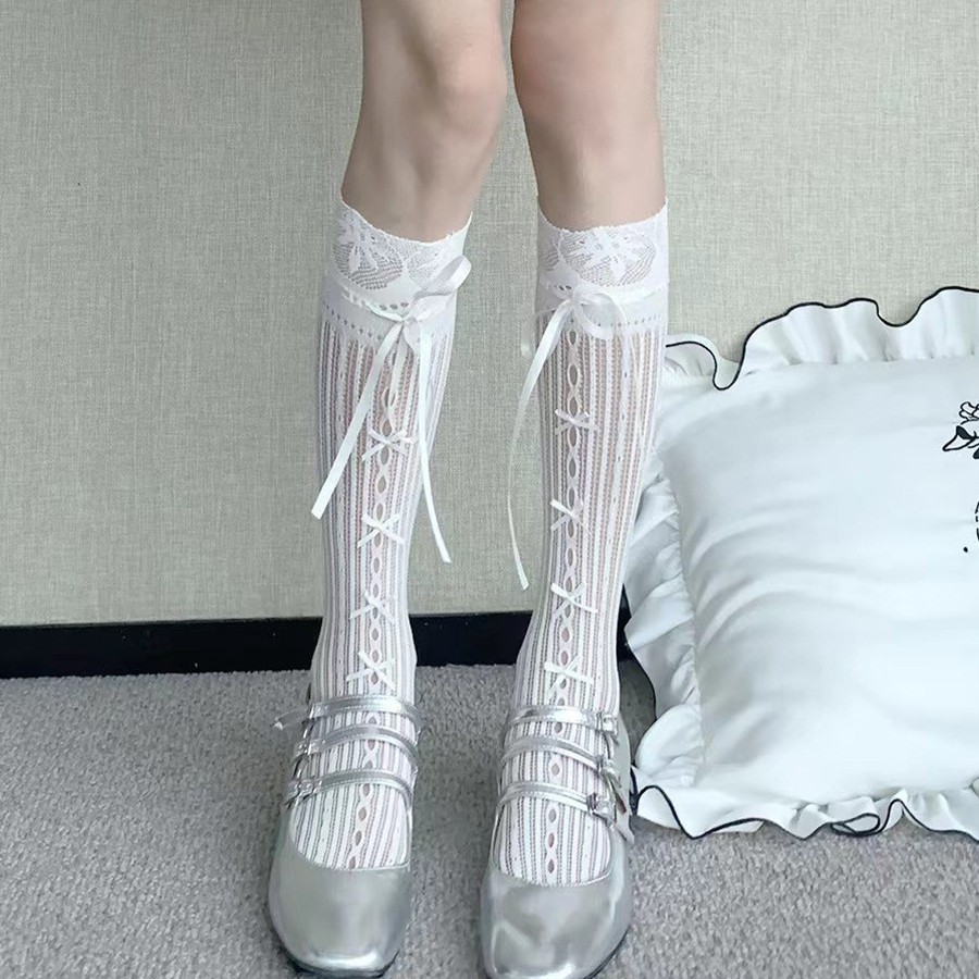 玛丽珍镂空白色蕾丝带蝴蝶结中筒袜子女夏季薄款绑带小腿堆堆网袜