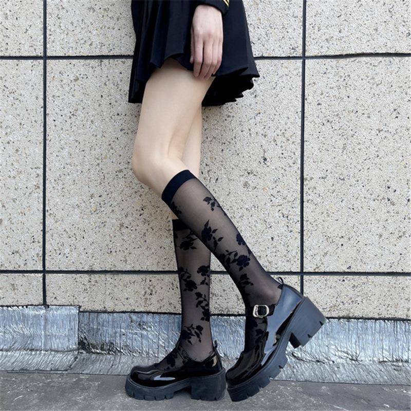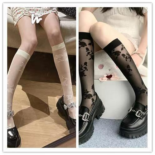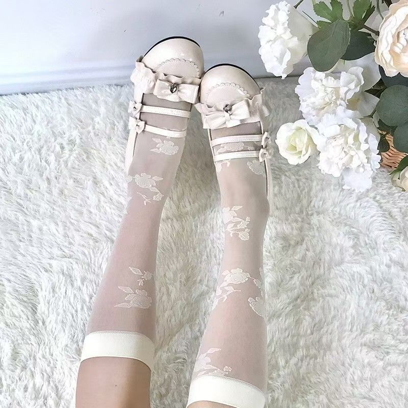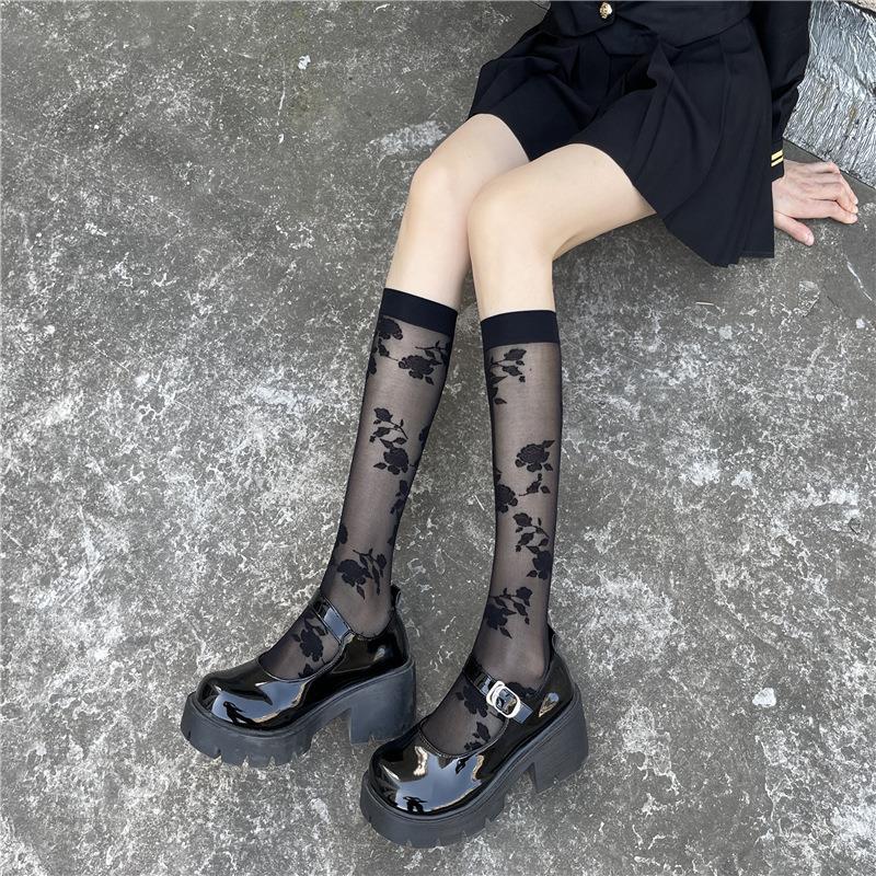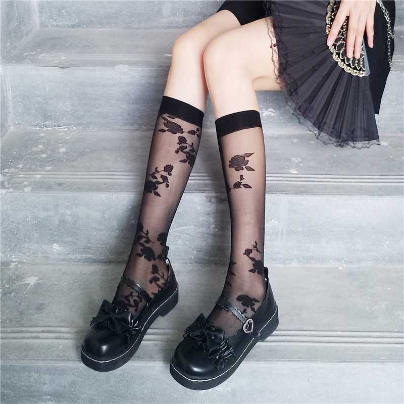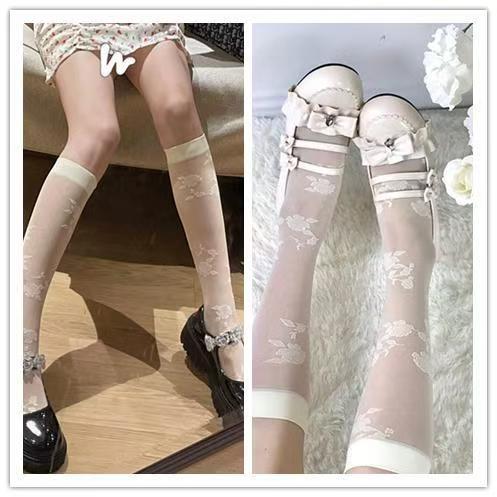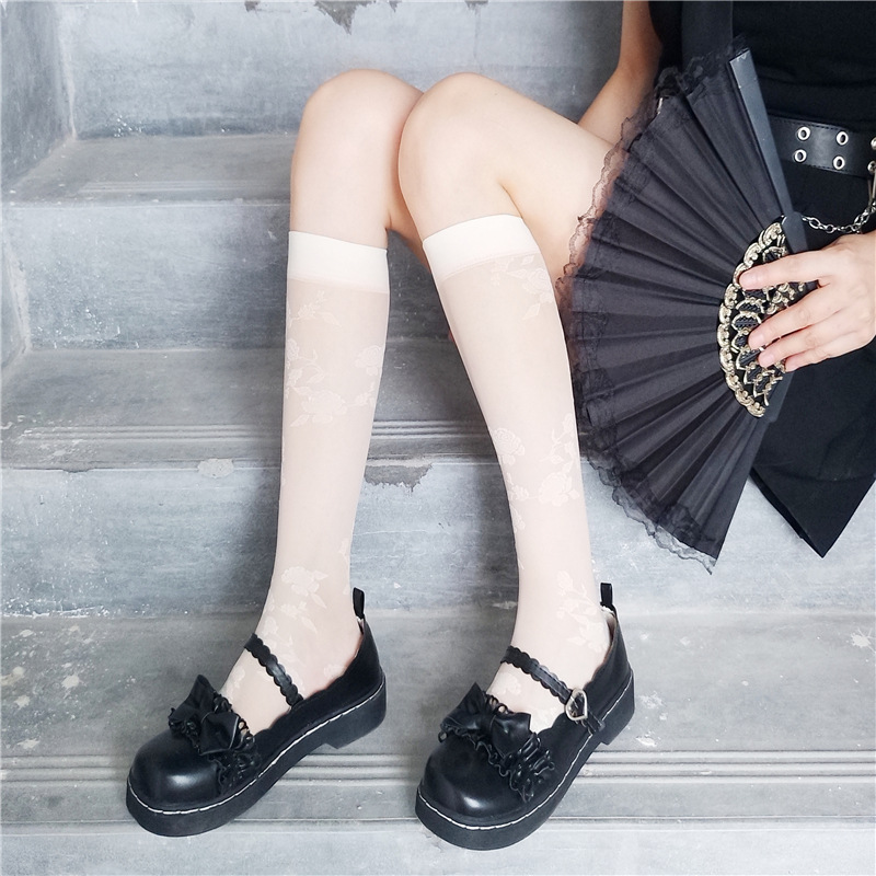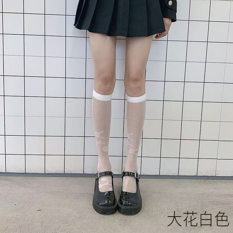 玫瑰花暗黑丝袜女薄款ins潮lolita日系jk中筒袜子春夏季长筒白色