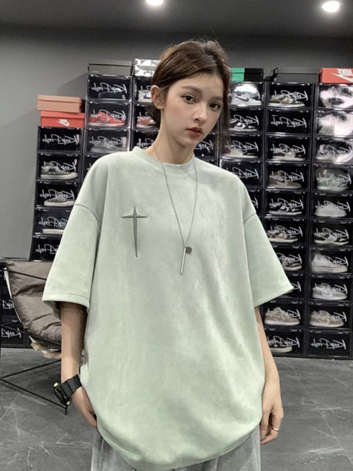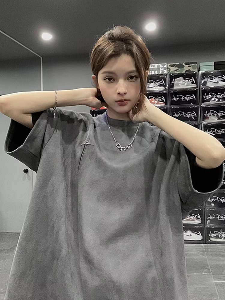 短袖t恤男夏季新款美式复古痞帅刺绣重磅潮牌宽松麂皮绒半袖体恤