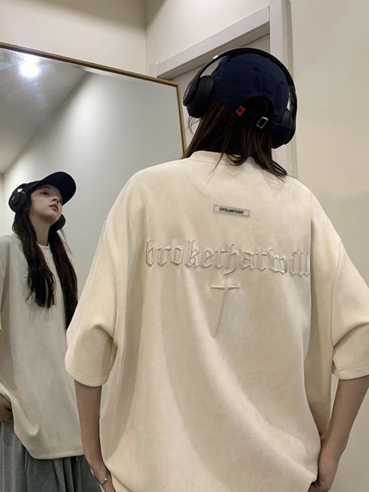 外贸批发韩版新款设计感3D凹凸立体字母宽松中长款半袖正肩T恤夏