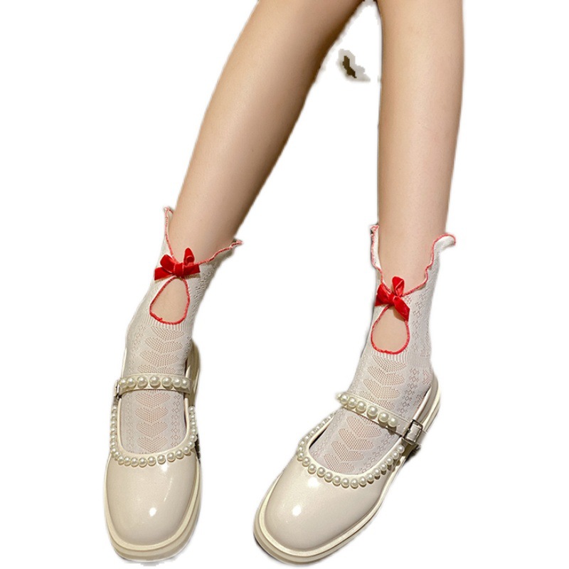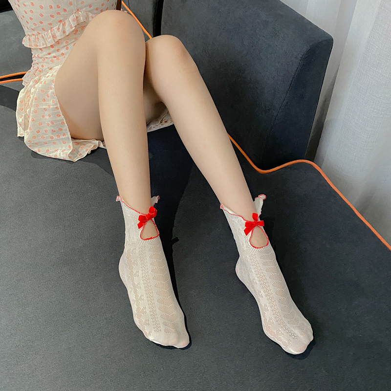 甜美日系蝴蝶结镂空袜子女白色夏季薄款可爱软妹洛丽塔春秋短筒袜