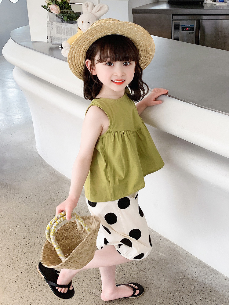 女童套装新款夏装韩版洋气女宝背心圆点灯笼裤时髦两件套2185