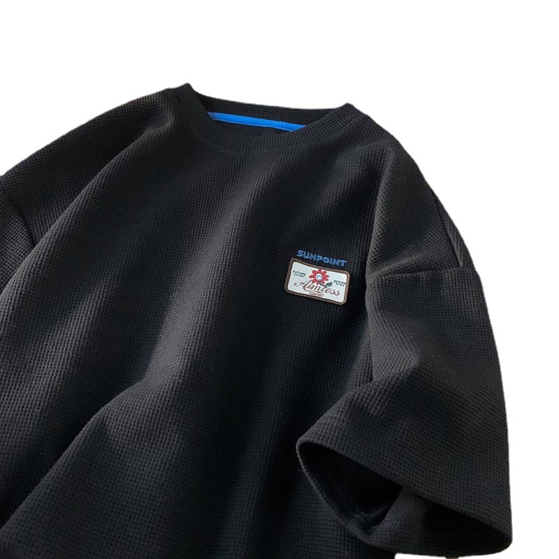 美式高街华夫格红色短袖T恤男潮牌百搭重磅半袖衣服宽松情侣夏装